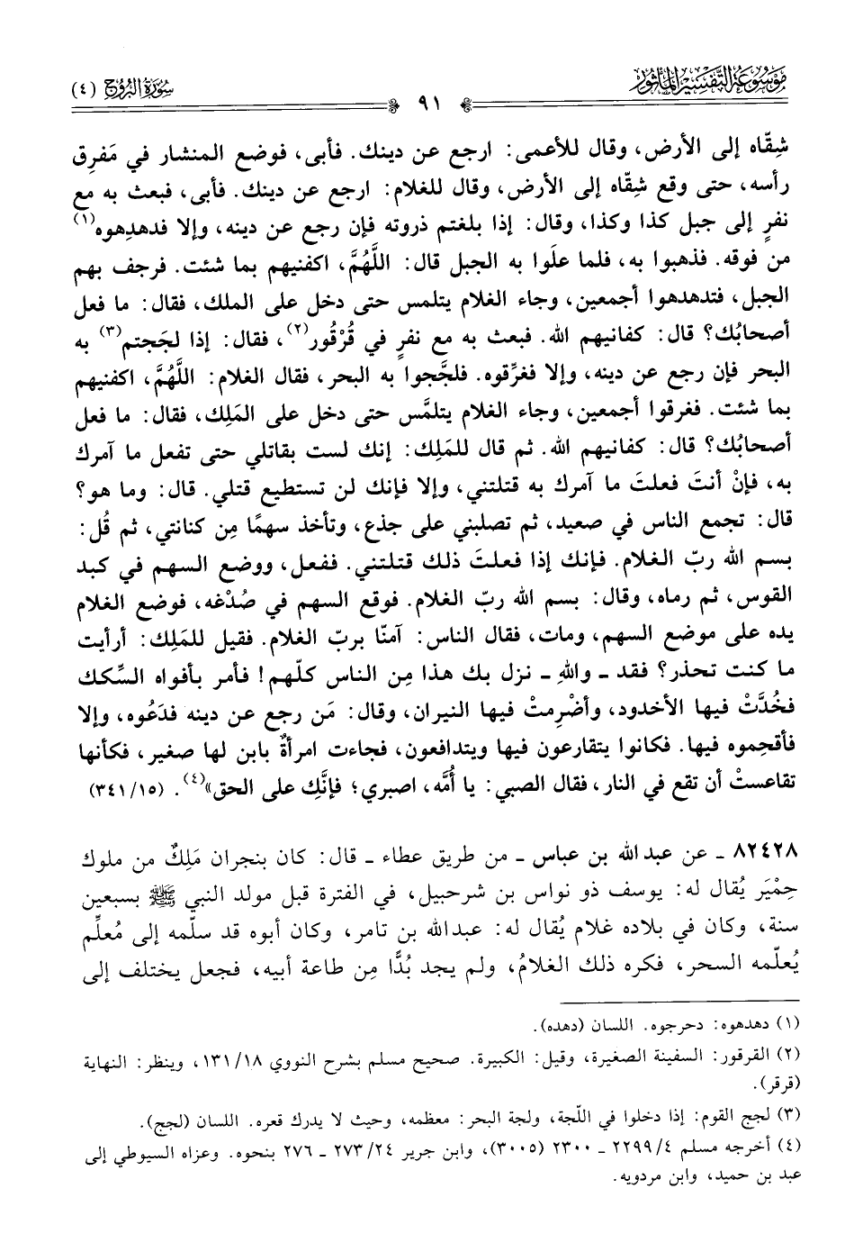 شِقّاه إلى الأرض، وقال للغلام: ارجع عن دينك. فأبى، فبعث به مع نفرٍ إلى جبل كذا وكذا، وقال: إذا بلغتم ذروته فإن رجع عن دينه، وإلا فدهدِهوه (¬١) من فوقه. فذهبوا به، فلما علَوا به الجبل قال: اللهم، اكفنيهم بما شئت. فرجف بهم الجبل، فتدهدهوا أجمعين، وجاء الغلام يتلمس حتى دخل على الملك، فقال: ما فعل أصحابُك؟ قال: كفانيهم الله. فبعث به مع نفرٍ في قُرْقُور (¬٢)، فقال: إذا لجَجتم (¬٣) به البحر فإن رجع عن دينه، وإلا فغرِّقوه. فلجَّجوا به البحر، فقال الغلام: اللهم، اكفنيهم بما شئت. فغرقوا أجمعين، وجاء الغلام يتلمَّس حتى دخل على المَلِك، فقال: ما فعل أصحابُك؟ قال: كفانيهم الله. ثم قال للمَلِك: إنك لست بقاتلي حتى تفعل ما آمرك به، فإنْ أنتَ فعلتَ ما آمرك به قتلتني، وإلا فإنك لن تستطيع قتلي. قال: وما هو؟ قال: تجمع الناس في صعيد، ثم تصلبني على جذع، وتأخذ سهمًا مِن كنانتي، ثم قُل: بسم الله ربّ الغلام. فإنك إذا فعلتَ ذلك قتلتني. ففعل، ووضع السهم في كبد القوس، ثم رماه، وقال: بسم الله ربّ الغلام. فوقع السهم في صُدْغه، فوضع الغلام يده على موضع السهم، ومات، فقال الناس: آمنّا بربّ الغلام. فقيل للمَلِك: أرأيت ما كنت تحذر؟ فقد -واللهِ- نزل بك هذا مِن الناس كلّهم! فأمر بأفواه السِّكك فخُدَّتْ فيها الأخدود، وأضْرِمتْ فيها النيران، وقال: مَن رجع عن دينه فدَعُوه، وإلا فأقحِموه فيها. فكانوا يتقارعون فيها ويتدافعون، فجاءت امرأةٌ بابن لها صغير، فكأنها تقاعستْ أن تقع في النار، فقال الصبي: يا أُمَّه، اصبري؛ فإنّكِ على الحق» (¬٤). (١٥/ ٣٤١)