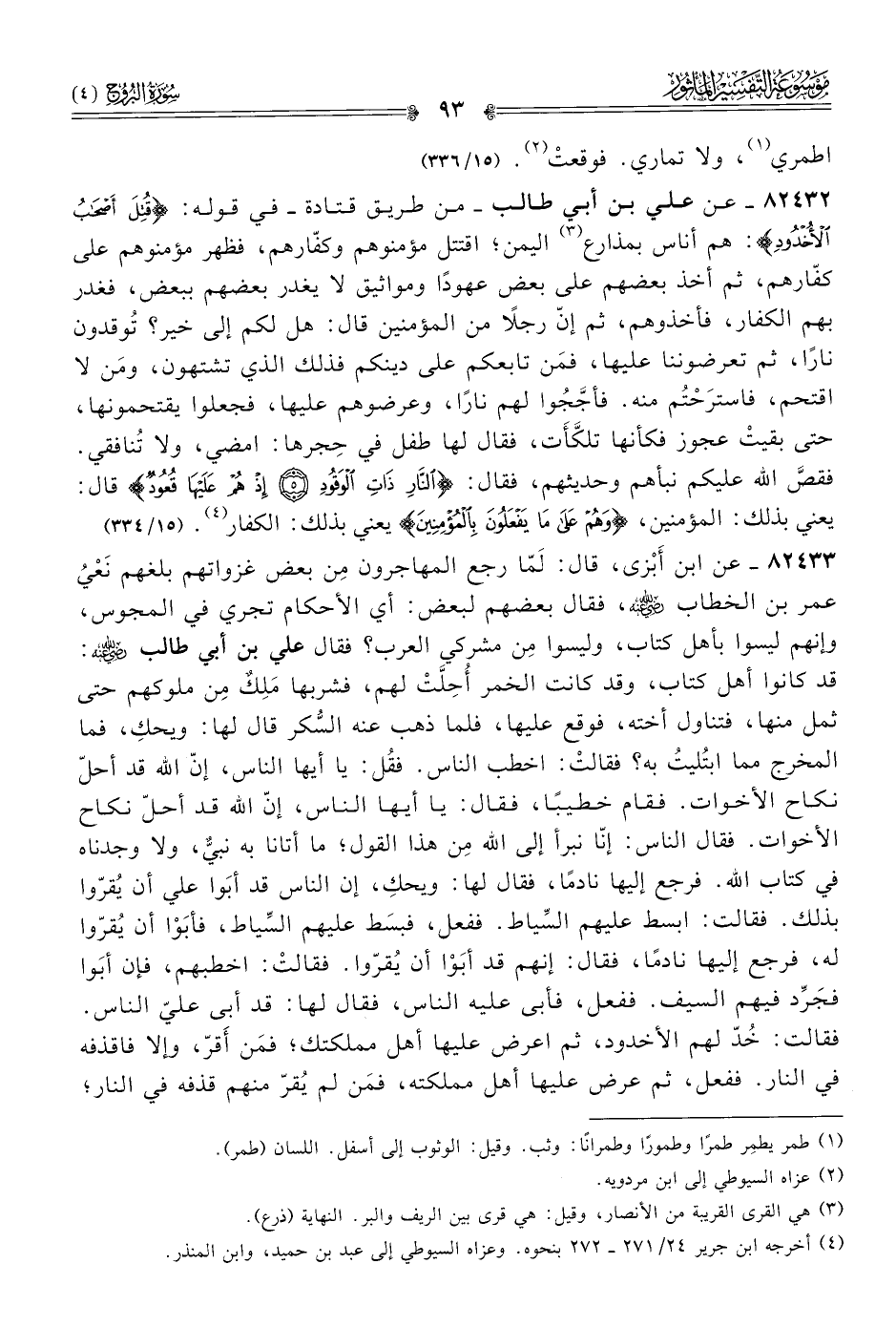 ٨٢٤٣٢ - عن علي بن أبي طالب -من طريق قتادة- في قوله: {قُتِلَ أصْحابُ الأُخْدُودِ}: هم أناس بمذارع (¬٣) اليمن؛ اقتتل مؤمنوهم وكفّارهم، فظهر مؤمنوهم على كفّارهم، ثم أخذ بعضهم على بعض عهودًا ومواثيق لا يغدر بعضهم ببعض، فغدر بهم الكفار، فأخذوهم، ثم إنّ رجلًا من المؤمنين قال: هل لكم إلى خير؟ تُوقدون نارًا، ثم تعرضوننا عليها، فمَن تابعكم على دينكم فذلك الذي تشتهون، ومَن لا اقتحم، فاسترَحْتُم منه. فأجَّجُوا لهم نارًا، وعرضوهم عليها، فجعلوا يقتحمونها، حتى بقيتْ عجوز فكأنها تلكَّأَت، فقال لها طفل في حِجرها: امضي، ولا تُنافقي. فقصَّ الله عليكم نبأهم وحديثهم، فقال: {النّارِ ذاتِ الوَقُودِ إذْ هُمْ عَلَيْها قُعُودٌ} قال: يعني بذلك: المؤمنين، {وهُمْ عَلى ما يَفْعَلُونَ بِالمُؤْمِنِينَ} يعني بذلك: الكفار (¬٤). (١٥/ ٣٣٤)