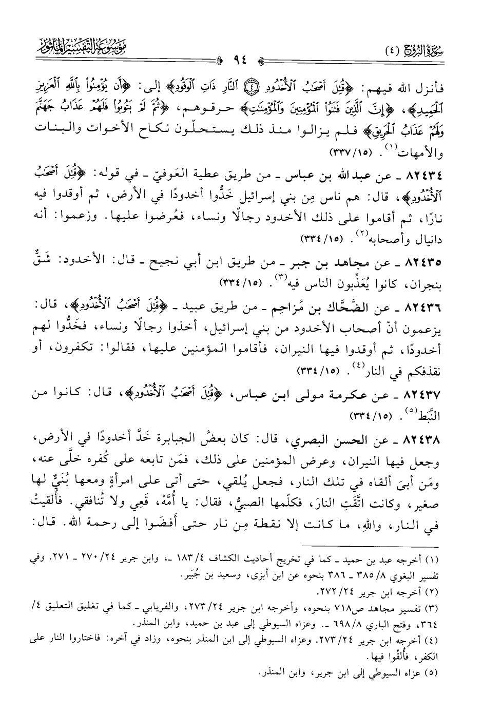 ٨٢٤٣٦ - عن الضَّحّاك بن مُزاحِم -من طريق عبيد- {قُتِلَ أصْحابُ الأُخْدُودِ}، قال: يزعمون أنّ أصحاب الأخدود من بني إسرائيل، أخذوا رجالًا ونساء، فخَدُّوا لهم أخدودًا، ثم أوقدوا فيها النيران، فأقاموا المؤمنين عليها، فقالوا: تكفرون، أو نقذفكم في النار (¬٤). (١٥/ ٣٣٤)