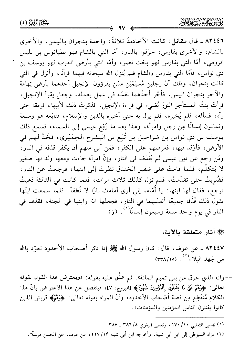 ٨٢٤٤٦ - قال مقاتل: كانت الأخاديدُ ثلاثةً: واحدة بنجران باليمن، والأخرى بالشام، والأخرى بفارس، حرّقوا بالنار، أمّا التي بالشام فهو بطيانوس بن بليس الرومي، أمّا التي بفارس فهو بخت نصر، وأمّا التي بأرض العرب فهو يوسف بن ذي نواس، فأمّا التي بفارس والشام فلم يُنزل الله سبحانه فيهما قرآنًا، وأنزل في التي كانت بنجران، وذلك أنّ رجلين مُسلِمَيْن ممّن يقرؤون الإنجيل أحدهما بأرض تِهامة والآخر بنجران اليمن، فأجّر أحدُهما نفسَه في عمل يعمله، وجعل يقرأ الإنجيل، فرأتْ بنتُ المستأجر النورَ يُضيء في قراءة الإنجيل، فذكرتْ ذلك لأبيها، فرمقه حتى رآه، فسأله، فلم يُخبره، فلم يزل به حتى أخبره بالدين والإسلام، فتابَعه هو وسبعة وثمانون إنسانًا مِن رجل وامرأة، وهذا بعد ما رُفِع عيسى إلى السماء، فسمع ذلك يوسف بن ذي نواس بن شراحيل بن تُبّع بن اليشرح الحِمْيَري، فخَدَّ لهم في الأرض، فأوَقد فيها، فعرضهم على الكفر، فمَن أبى منهم أن يكفر قذفه في النار، ومَن رجع عن دين عيسى لم يُقذَف في النار، وإنّ امرأة جاءت ومعها ولد لها صغير لا يَتكلّم، فلما قامتْ على شفير الخندق نظرتْ إلى ابنها، فرجعتْ عن النار، فضُرِبتْ حتى تقدّمتْ، فلم تزل كذلك ثلاث مرات، فلما كانت في الثالثة ذهبتْ ترجع، فقال لها ابنها: يا أُمّاه، إني أرى أمامك نارًا لا تُطفأ. فلما سمعت ابنَها يقول ذلك قَذَفا جميعًا أنفسَهما في النار، فجعلها الله وابنها في الجنة، فقذف في النار في يوم واحد سبعة وسبعون إنسانًا (¬١). (ز)