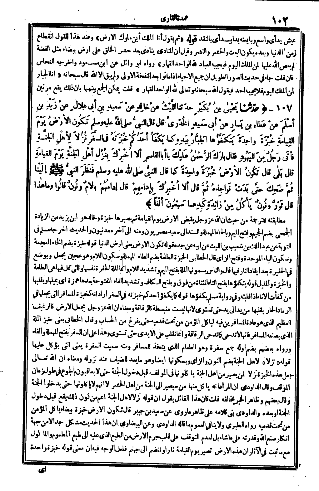 قلت: كَانَ هَذَا الْقَائِل يَقُول: إِن قَوْله: (نزلا لأهل الْجنَّة) أَعم من كَون ذَلِك يَقع قبل دُخُول الْجنَّة أَو بعده، والداودي بنى كَلَامه على ظَاهر مَا رُوِيَ عَن سعيد بن جُبَير، قَالَ: تكون الأَرْض خبْزَة بَيْضَاء يَأْكُل الْمُؤمن من تَحت قَدَمَيْهِ، رَوَاهُ الطَّبَرِيّ، وَلَا يُنَافِي الْعُمُوم مَا قَالَه الدَّاودِيّ، وَعَن الْبَيْضَاوِيّ أَن هَذَا الحَدِيث مُشكل جدا لَا من جِهَة إِنْكَار صنع الله وَقدرته على مَا يَشَاء، بل لعدم التَّوَقُّف على قلب جرم الأَرْض من الطَّبْع الَّذِي عَلَيْهِ إِلَى طبع المطعوم والمأكول مَعَ مَا ثَبت فِي الْآثَار أَن هَذِه الأَرْض تصير يَوْم الْقِيَامَة نَارا وتنضم إِلَى جَهَنَّم، فَلَعَلَّ الْوَجْه فِيهِ أَن معنى قَوْله: (خبْزَة وَاحِدَة)