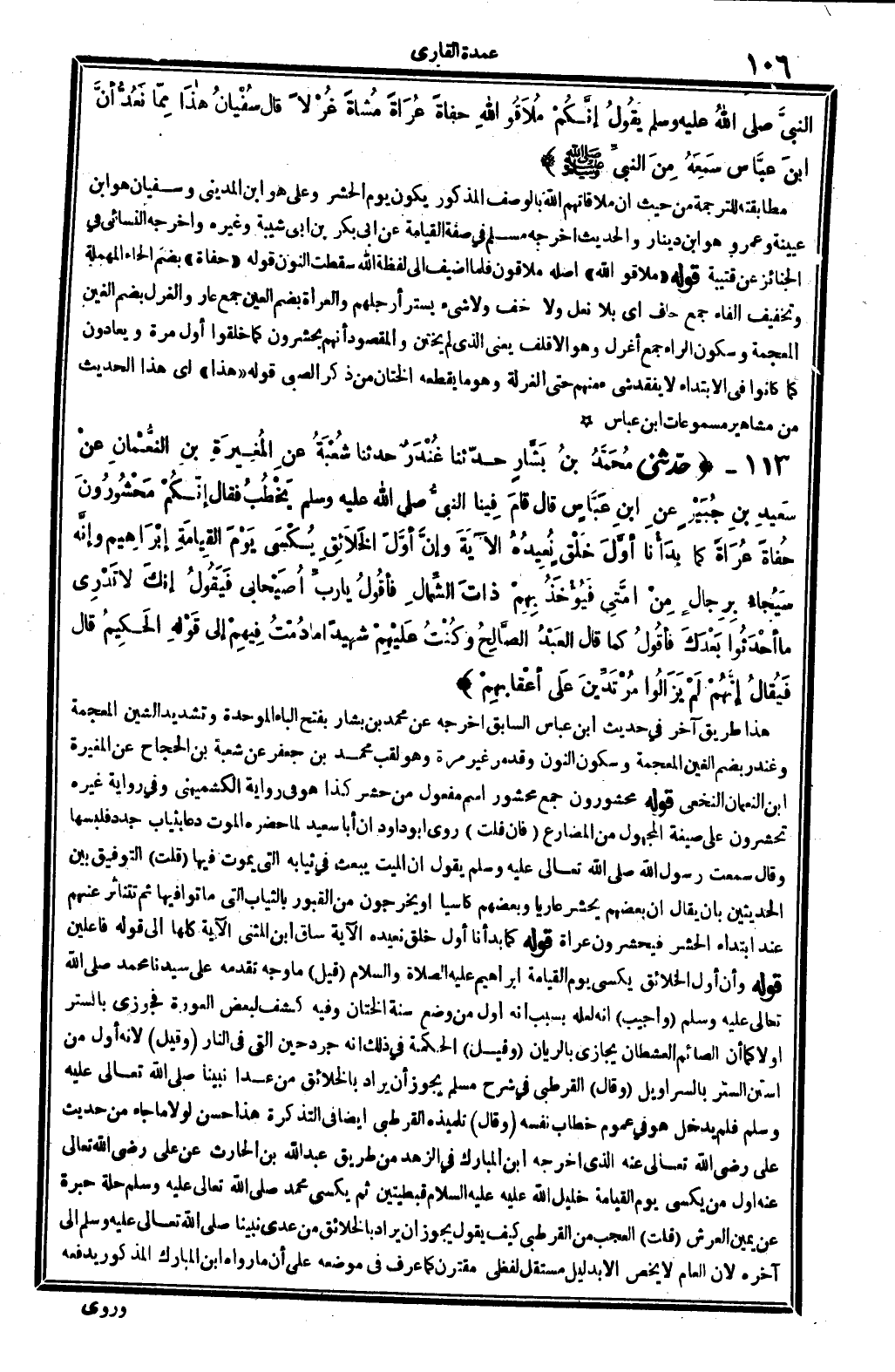 6256 - حدّثني مُحَمَّدُ بنُ بَشَّارٍ حدّثنا غُنْدَرٌ حَدثنَا شُعْبَةُ عنِ المُغِيرَةِ بنِ النُّعمْانِ عنْ سَعِيدِ بنِ جُبَيْرٍ عنِ ابنِ عَبَّاسٍ قَالَ: قامَ فِينا النبيُّ صلى الله عَلَيْهِ وَسلم يَخْطُبُ فَقَالَ: (إنّكُمْ مَحْشُورُونَ حُفاةً عُرَاةً {كَمَا بدأنا أول خلق نعيده} (الْأَنْبِيَاء: 401) الْآيَة ... وإنَّ أوَّلَ الخَلائِقِ يُكْسَى يَوْمَ القِيامَةِ إبْراهيم، وإنَّه سَيُجاءُ بِرِجالٍ مِنْ أمَّتِي فَيُؤْخَذُ بِهِمْ ذاتَ الشِّمالِ، فأقُولُ: يَا ربِّ! أُصَيْحابي: فَيَقُولُ: إنكَ لَا تَدْرِي مَا أحْدَثُوا بَعْدَكَ. فأقُولُ كَمَا قَالَ العَبْدُ الصَّالِحِ: {وَكنت عَلَيْهِم شَهِيدا مَا دمت فيهم} ... إِلَى قَوْله {الْحَكِيم} (الْمَائِدَة: 711) قَالَ: فَيُقالُ: إنَّهُمْ لَمْ يَزَالُوا مُرْتَدِّينَ على أعْقابِهِمْ) .