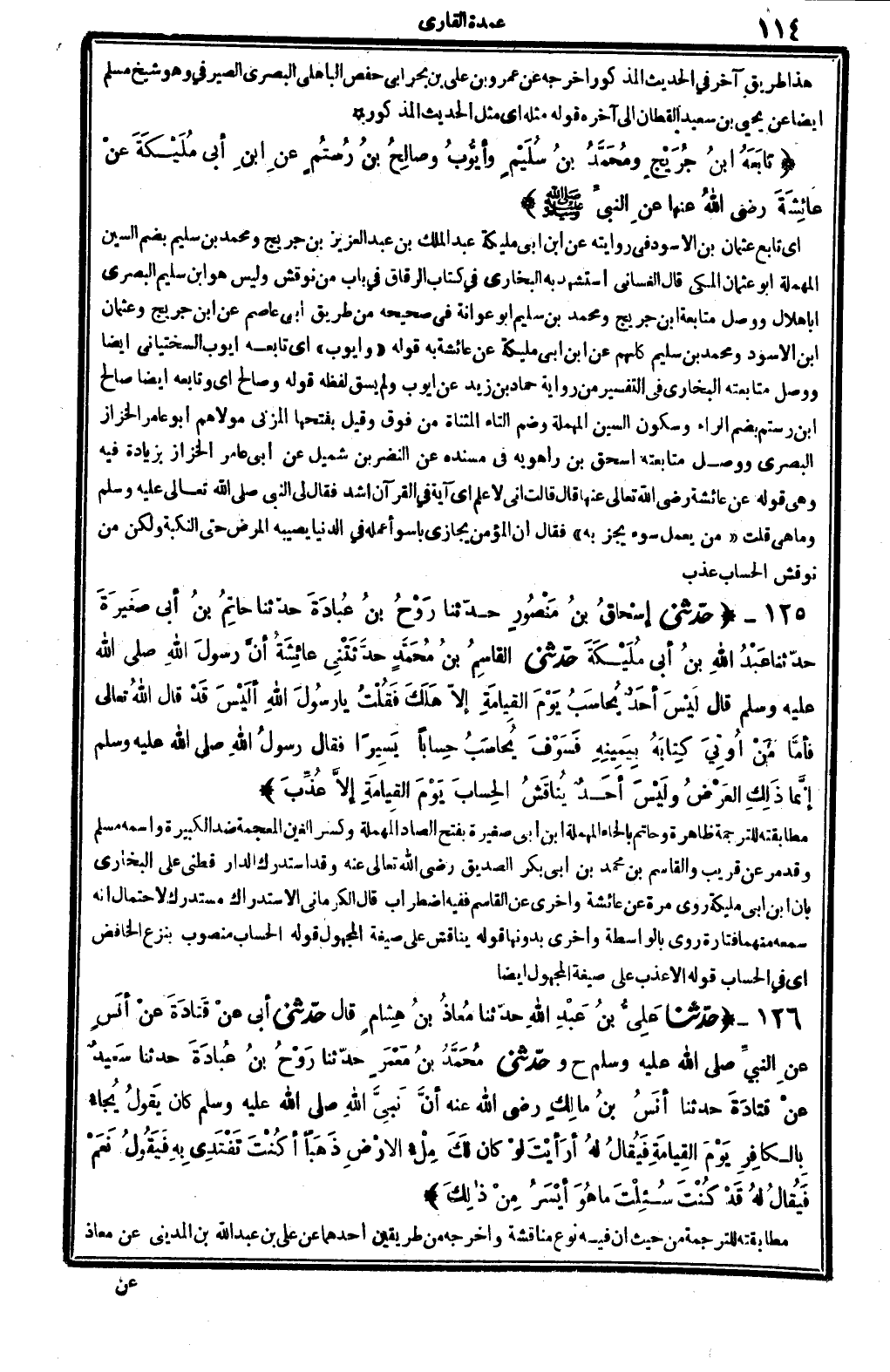 7356 - حدّثني إسْحاقُ بنُ مَنْصُورٍ حدّثنا رَوْحُ بنُ عُبادَةَ حدّثنا حاتِمُ بنُ أبي صَغِيرَةَ حدّثنا عَبْدُ الله بنُ أبي مُلَيْكَةَ حدّثني القاسِمُ بنُ مُحَمَّدٍ حدَّثَتْنِي عائِشَةُ: أنَّ رسولَ الله صلى الله عَلَيْهِ وَسلم قَالَ: (لَيْسَ أحَدٌ يُحاسَبُ يَوْمَ القِيامَةِ إلاّ هَلَكَ) فَقُلْتُ: يَا رَسُولَ الله! ألَيْسَ قَدْ قَالَ الله تَعَالَى: {فَأَما من أُوتِيَ كِتَابه بِيَمِينِهِ فَسَوف يُحَاسب حسابا يَسِيرا} (الانشقاق: 8) فَقَالَ رسولُ الله صلى الله عَلَيْهِ وَسلم: (إنَّما ذَلِك العَرْضُ ولَيْسَ أحَدٌ يُناقَشُ الحِسابَ يَوْمَ القِيامَةِ إلاَّ عُذِّبَ) .