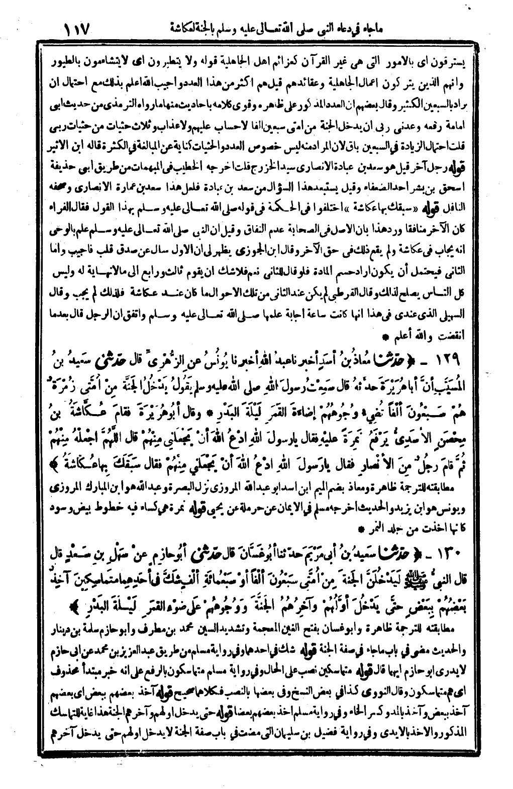 وَقَالَ أبُو هُرَيْرَةَ: فقامَ عُكَّاشَةُ بنُ مِحْصَنِ الأسَدِيُّ، يَرْفَعُ نَمِرَةً عليْهِ، فَقَالَ: يَا رسولَ الله {ادْعُ الله أنْ يَجْعَلَنِي مِنْهُمْ. قَالَ: (اللَّهُمَّ اجْعلْهُ مِنْهُمْ) ثُمَّ قامَ رجُلٌ مِنَ الأنْصارِ، فَقَالَ: يَا رَسولَ الله} ادْعُ الله أنْ يَجْعَلني عَنْهمْ. فَقَالَ: (سَبَقَكَ بهَا عُكَاشَةُ) . (انْظُر الحَدِيث 1185) .