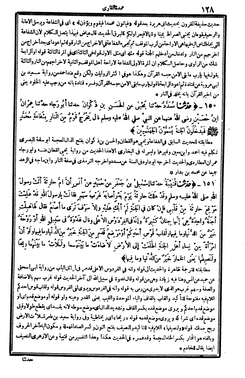 7656 - حدّثنا قُتَيْبَةُ حدّثنا إسْماعِيلُ بنُ جَعْفَرِ عنْ حُمَيْدٍ عنْ أنَسٍ: أنَّ أمَّ حارِثَةَ أتَتْ رسولَ الله صلى الله عَلَيْهِ وَسلم وقَدْ هَلَكَ حارِثَةُ يَوْمَ بَدْرٍ، أصابَهُ غَرْبُ سَهْمٍ، فقالَتْ: يَا رسولَ الله! قَدْ عَلِمْتَ مَوْقِعَ حارِثَةَ مِنْ قَلْبِي، فإنْ كَانَ فِي الجَنّةِ لَمْ أبْكِ عَلَيْهِ وإلاّ سَوْفَ تَرَى مَا أصْنَعُ. فَقَالَ لَهَا: (هَبِلْتِ؟ أجَنَّةٌ واحِدةٌ هِيَ إنّها جِنانٌ كَثِيرَةٌ؟ وإنّهُ فِي الفِرْدَوُسِ الأعْلَى؟) وَقَالَ: (غَدْوَةٌ فِي سَبِيلٍ الله أوْ رَوْحَةٌ خَيْرٌ مِنَ الدُّنْيا وَمَا فِيها، ولَقابُ قَوْسِ أحَدِكُمْ أوْ مَوْضِعُ قَدَمٍ مِنَ الجَنّةِ خَيْرٌ مِنَ الدُّنْيا وَمَا فِيها، ولَوْ أنَّ امْرَأةً مِنْ نِساءٍ أهْلِ الجَنّةِ اطَّلَعَتْ إِلَى الأرْضِ لأضاءَتْ مَا بَيْنَهُما ولَمَلأتْ مَا بَيْنَهُما رِيحاً، ولَنَصِيفُها يَعْنِي: الخمارَ خَيْرٌ مِنَ الدُّنيْا وَمَا فِيها) . (انْظُر الحَدِيث 2972 وطرفه) .