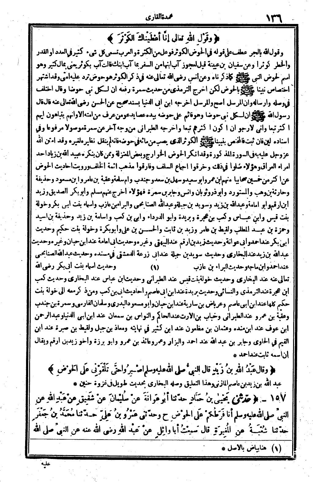 وَقَول الله بِالْجَرِّ عطف على قَوْله: فِي الْحَوْض، الْكَوْثَر فوعل من الْكَثْرَة، وَالْعرب تسمى كل شَيْء كثير فِي الْعدَد أَو الْقدر والخطر: كوثراً، وَعَن سُفْيَان بن عُيَيْنَة: قيل لعجوز آب ابْنهَا من السّفر: بِمَا آب ابْنك؟ قَالَت: آب بكوثر، يَعْنِي: بِمَال كثير، وَهُوَ اسْم لحوض النَّبِي صلى الله عَلَيْهِ وَسلم كَمَا ذَكرْنَاهُ، وَعَن أنس رَضِي الله تَعَالَى عَنهُ. فِي ذكر الْكَوْثَر: هُوَ حَوْض ترد عَلَيْهِ أمتِي، وَقد اشْتهر اخْتِصَاص نَبينَا صلى الله عَلَيْهِ وَسلم بالحوض، لَكِن أخرج التِّرْمِذِيّ من حَدِيث سَمُرَة رَفعه: أَن لكل نَبِي حوضاً، وَقَالَ اخْتلف فِي وَصله وإرساله وَأَن الْمُرْسل أصح، والمرسل أخرجه ابْن أبي الدُّنْيَا بِسَنَد صَحِيح عَن الْحسن رَضِي الله تَعَالَى عَنهُ، قَالَ: قَالَ رَسُول الله صلى الله عَلَيْهِ وَسلم إِن لكل نَبِي حوضاً وَهُوَ قَائِم على حَوْضه بِيَدِهِ عَصا يَدْعُو من عرف من أمته، أَلا وَإِنَّهُم يتباهون أَيهمْ أَكثر تبعا وَإِنِّي لأرجو أَن أكون أَكْثَرهم تبعا، وَأخرجه الطَّبَرَانِيّ من وَجه آخر عَن سَمُرَة مَوْصُولا مَرْفُوعا، وَفِي إِسْنَاد لين فَإِن ثَبت فالمختص بنبينا صلى الله عَلَيْهِ وَسلم الْكَوْثَر الَّذِي يصب من مَائه فِي حَوْضه فَإِنَّهُ لم ينْقل نَظِيره لغيره، وَقد امتن الله عز وَجل عَلَيْهِ بِهِ فِي السُّورَة الْمَذْكُورَة.
