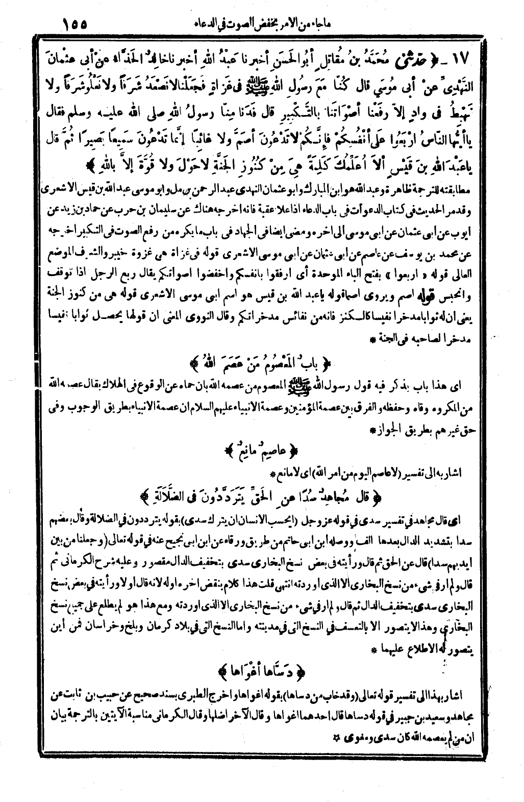 0166 - حدّثني مُحَمَّدُ بنُ مُقاتِلٍ أبُو الحَسَنِ أخبرنَا عَبْدُ الله أخبرنَا خالِدٌ الحَذَّاءُ عنْ أبي عثْمانَ النَّهْدِيِّ عنْ أبي مُوسَى قَالَ: كُنّا مَعَ رسُولِ الله صلى الله عَلَيْهِ وَسلم فِي غَزاةٍ، فَجَعَلْنا لَا نَصْعَدُ شَرَقاً وَلَا نَعْلُو شَرَقاً وَلَا نَهْبِطُ فِي وادٍ إلاّ رَفَعْنا أصْوَاتَنا بالتَّكْبِيرِ، قَالَ: فَدَنا مِنّا رسولُ الله صلى الله عَلَيْهِ وَسلم فَقَالَ: (يَا أيُّها النّاس أرْبَعُوا عَلَى أنْفُسِكُمْ، فإنَّكُم لَا تَدْعُونَ أصَمَّ وَلَا غائِباً، إنَّما تَدْعُونَ سَمِيعاً بَصِيراً) ثُمَّ قَالَ: (يَا عَبْدَ الله بنَ قَيْسٍ! ألاَ أُعَلِّمُكَ كَلِمَةً هِيَ مِنْ كُنُوزِ الجَنَّةِ: لَا حَوْلَ وَلَا قُوَّةَ إلاَّ بِاللَّه) .