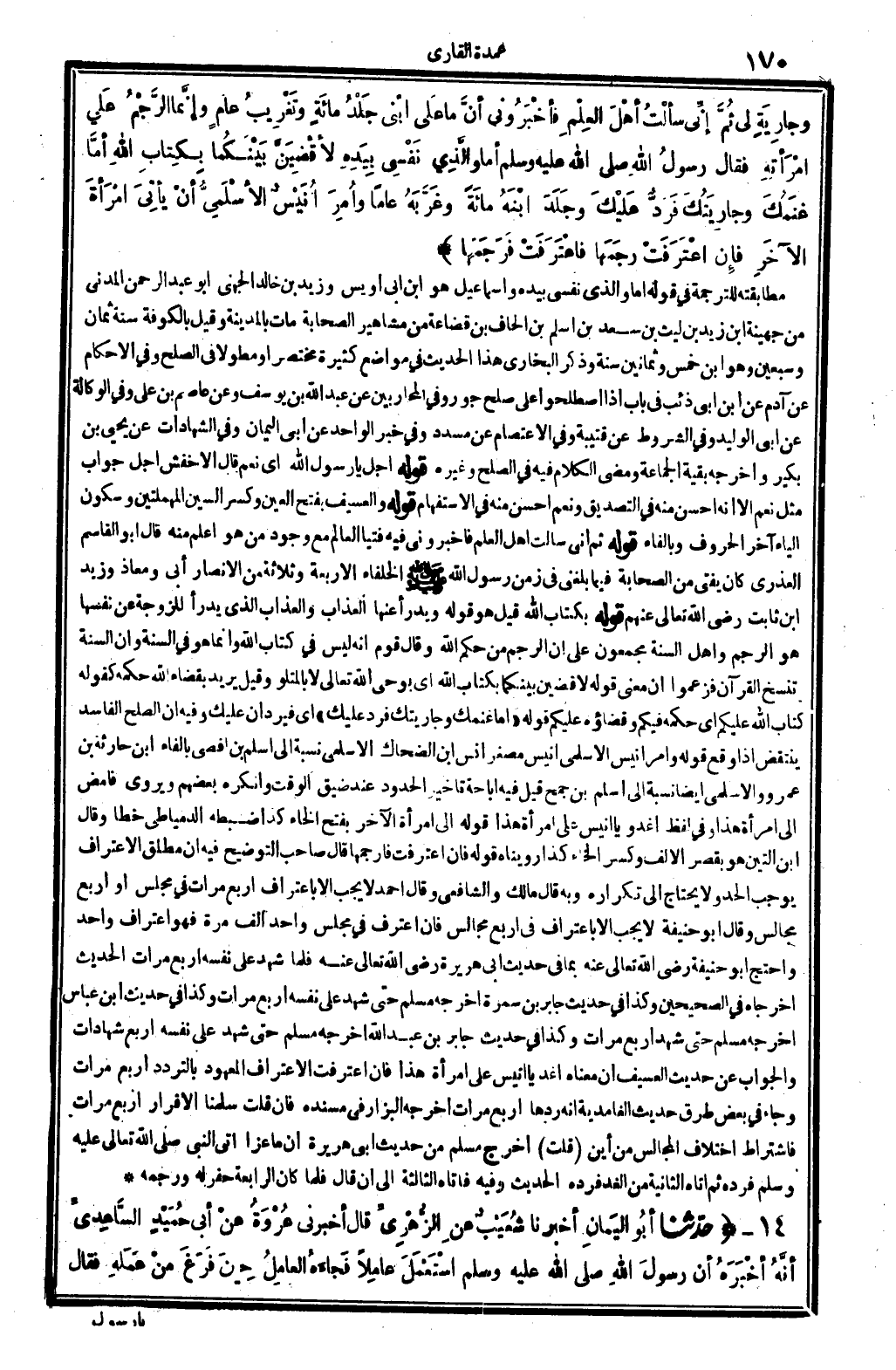 وجارِيَةٍ لي ثُمَّ إنِّي سألْتُ أهْلَ العِلْمِ فأخْبَرُونِي أنَّ مَا عَلى ابْنِي جَلْدُ مائَةٍ وتَغْرِيبُ عامٍ، وإنَّما الرَّجْمُ عَلى امْرَأتِهِ. فَقَالَ رسولُ الله صلى الله عَلَيْهِ وَسلم: (أما والَّذِي نَفْسِي بِيَدِهِ لأقْضيَنَّ بَيْنَكُما بِكِتابِ الله! أمَّا غنَمُكَ وجارِيَتُكَ فَرَدٍّ عَلَيْك) ، وجَلَدَ ابْنَهُ مائَةً وغَرَّبَهُ عَاما، وأُمِرَ أُنَيْسٌ الأسْلَمِيُّ أنْ يأتِيَ امْرَأةَ الآخَرِ، فَإِن اعْتَرَفَتْ رَجَمعَها فاعْتَرَفَتْ فَرَجَمَها.