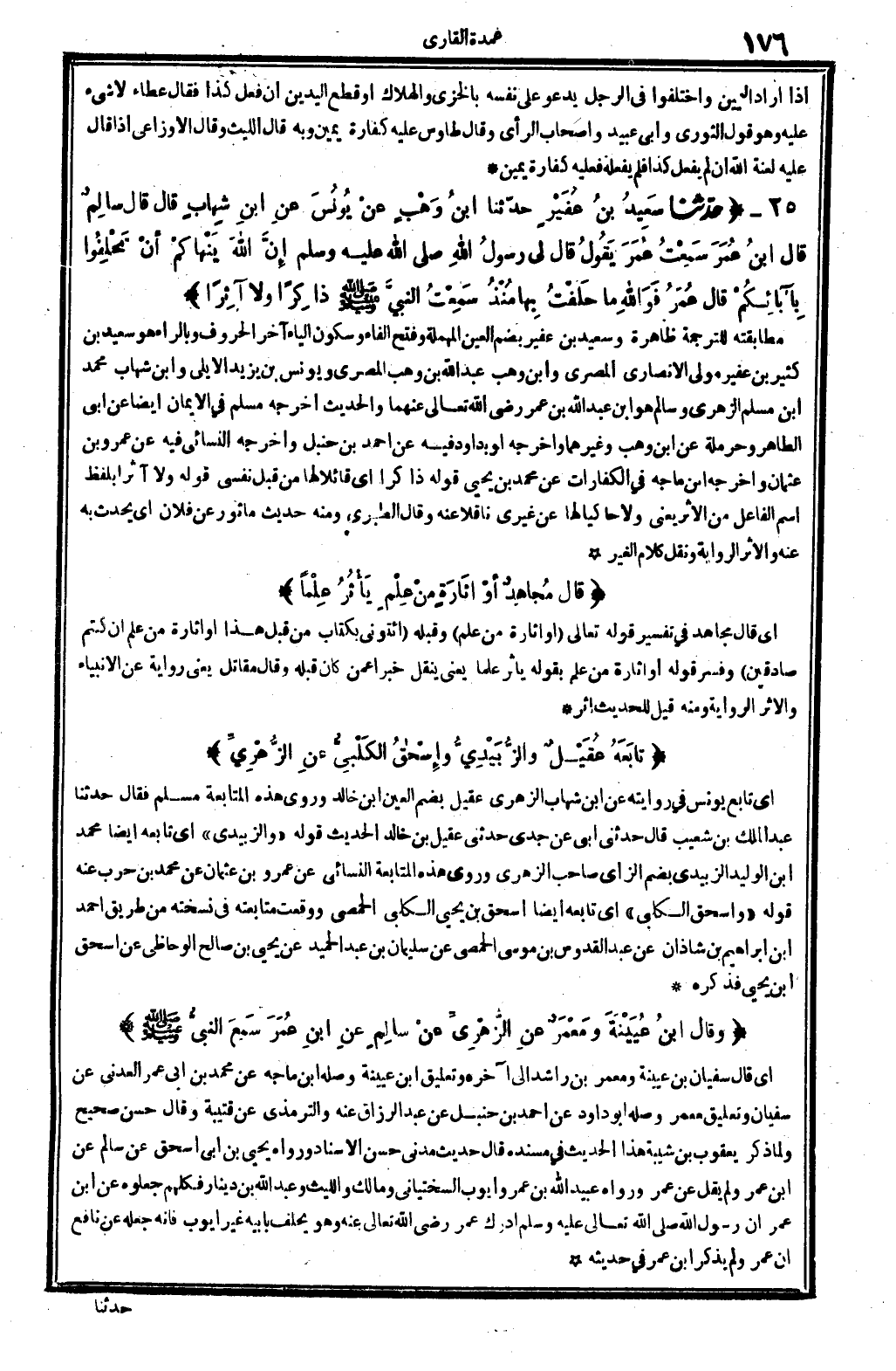 7466 - حدّثنا سَعِيدُ بنُ عُفَيْرٍ حدّثنا ابنُ وَهْبٍ عنْ يُونُسَ عنِ ابنِ شِهابٍ قَالَ: قَالَ سالِمٌ: قَالَ ابنُ عُمَرَ: سَمِعْتُ عُمَرَ يَقُولُ: قَالَ لِي رسولُ الله صلى الله عَلَيْهِ وَسلم: (إنَّ الله يَنْهاكُمْ أنْ تَحْلِفُوا بِآبائِكُمْ) . قَالَ عُمَرُ: فَوَالله مَا حَلَفْتُ بِها مُنْذُ سَمُعْتُ النبيَّ صلى الله عَلَيْهِ وَسلم ذاكِراً وَلَا آثِراً.