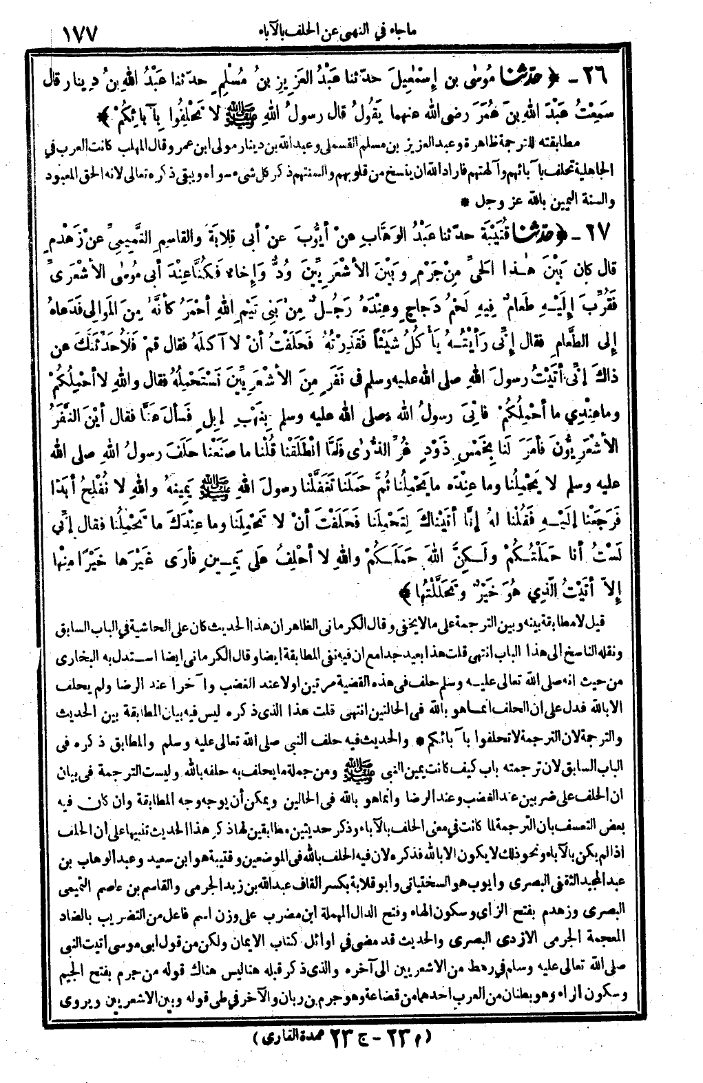 8466 - حدّثنا مُوسى بن إسْماعِيلَ حدّثنا عَبْدُ العَزِيزِ بنُ مُسْلِمٍ حدّثنا عَبْدُ الله بنُ دِينار قَالَ: سَمِعْتُ عَبْدَ الله بنَ عُمَرَ رَضِي الله عَنْهُمَا، يَقُولُ: قَالَ رسولُ الله صلى الله عَلَيْهِ وَسلم: (لَا تَحْلِفُوا بِآبائِكُمْ) .