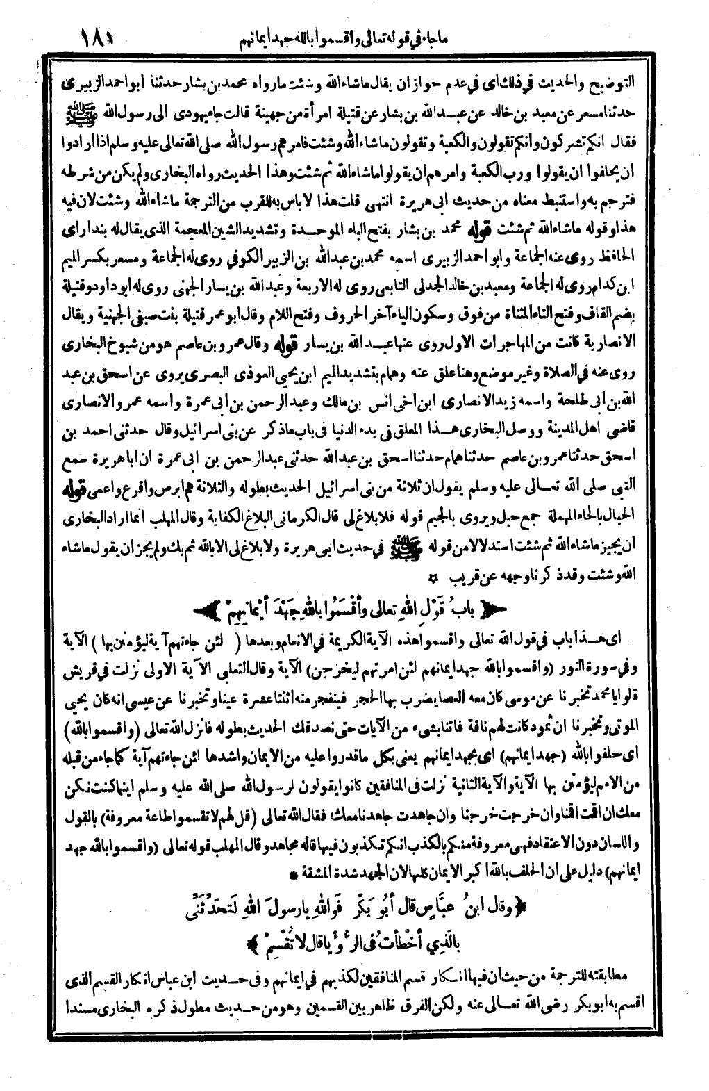 (التَّوْضِيح) : والْحَدِيث فِي ذَلِك أَي فِي عدم جوازان يُقَال مَا شَاءَ الله وشئت، مَا رَوَاهُ مُحَمَّد بن بشار حَدثنَا أَبُو أَحْمد الزبيرِي حَدثنَا مسعر عَن معبد بن خَالِد عَن عبد الله بن بشار عَن قتيلة، امْرَأَة من جُهَيْنَة، قَالَت: جَاءَ يَهُودِيّ إِلَى رَسُول الله صلى الله عَلَيْهِ وَسلم فَقَالَ: إِنَّكُم تشركون وَإِنَّكُمْ تَقولُونَ: والكعبة، وتقولون: مَا شَاءَ الله وشئت. فَأَمرهمْ رَسُول الله صلى الله عَلَيْهِ وَسلم، إِذا أَرَادوا أَن يحلفوا أَن يَقُولُوا: وَرب الْكَعْبَة، وَأمرهمْ أَن يَقُولُوا: مَا شء الله ثمَّ شِئْت.