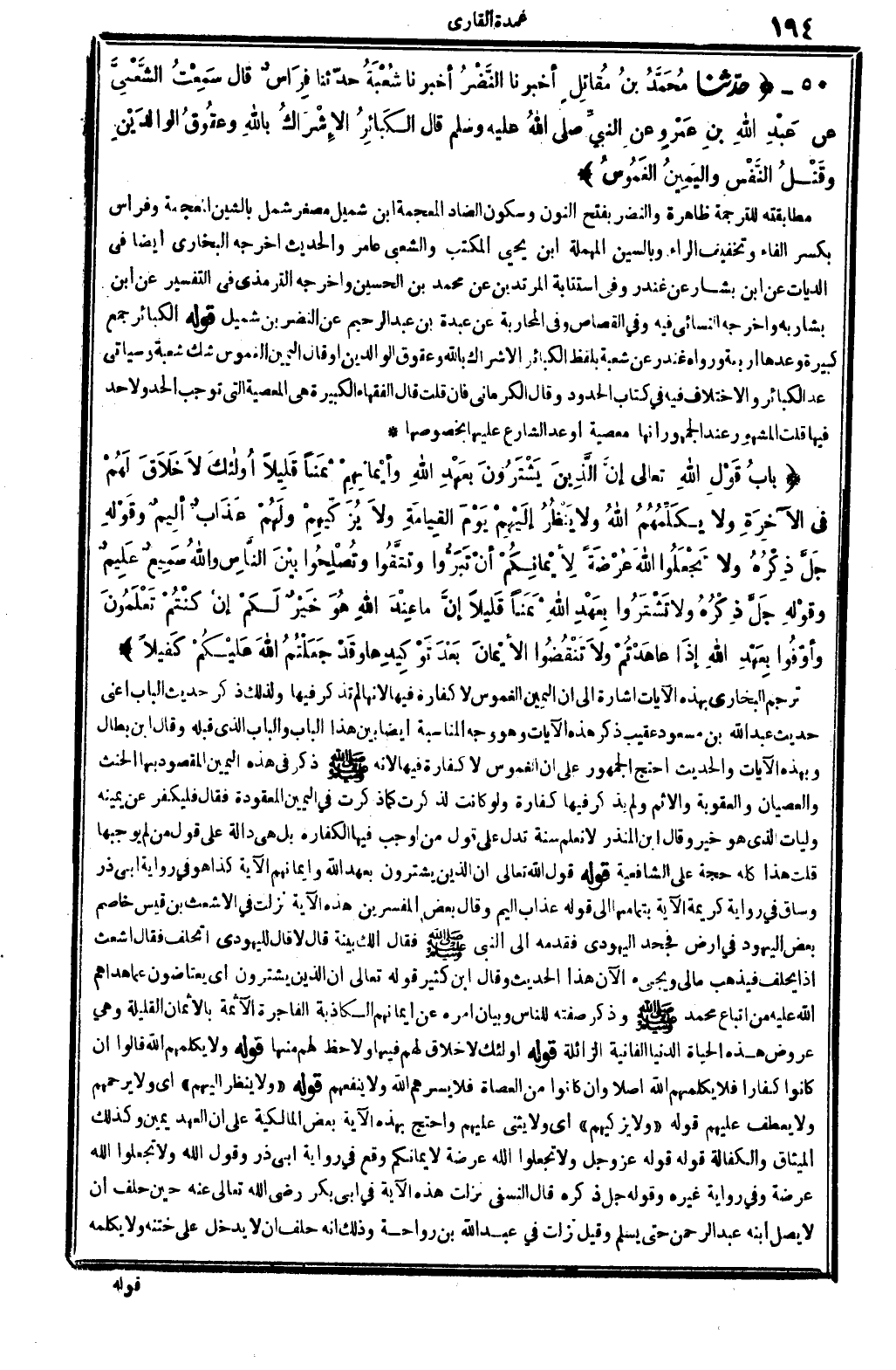 71 - (بابُ قَوْلِ الله تَعَالَى: {إِن الَّذين يشْتَرونَ بِعَهْد الله وَأَيْمَانهمْ ثمنا قَلِيلا أولائك لَا خلاق لَهُم فِي الأخرة وَلَا يكلمهم الله وَلَا ينظر إِلَيْهِم يَوْم الْقِيَامَة وَلَا يزكيهم وَلَهُم عَذَاب أَلِيم} (آل عمرَان: 77) وقَوْلِهِ جَلَّ ذِكْرُهُ: {وَلَا تجْعَلُوا الله عرضة لأيمانكم أَن تبروا وتتقوا وتصلحوا بَين النَّاس وَالله سميع عليم} (الْبَقَرَة: 422) وقوْلِهِ جَلَّ ذِكْرُهُ {وَلَا تشتروا بِعَهْد الله ثمنا قَلِيلا إِن مَا عِنْد الله خير لكم إِن كُنْتُم تعلمُونَ} (النَّحْل: 59) {وأوفوا بِعَهْد الله إِذا عاهذتم وَلَا تنقضوا الْأَيْمَان بعد توكيدها وَقد جعلتم الله عَلَيْكُم كَفِيلا} (النَّحْل: 19)