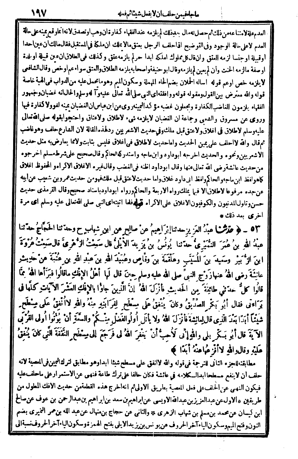 العَشْرَ الآياتِ كلَّها فِي بَرَاءَتِي، فَقَالَ أبُو بَكْرٍ الصِّدِّيقُ، وكانَ يُنْفِقُ عَلى مِسْطَحِ لِقَرَابَتِهِ مِنْهُ: وَالله لَا أُنْفِقُ عَلى مِسْطَحِ شَيْئاً أبَداً بَعْدَ الّذِي قَالَ لِعائِشَة، فأنْزَل الله: {وَلَا يَأْتَلِ أولُوا الْفضل مِنْكُم وَالسعَة أَو يؤتوا ولي الْقُرْبَى} (النُّور: 22) الْآيَة. قَالَ أبُو بَكْرٍ: بلَى وَالله إنِّي لأُحبُّ أنُ يَغْفِرَ الله لي، فَرَجَعَ إِلَى مِسْطَحٍ النَّفْقَةَ الَّتِي كانَ يُنْفِقُ عَلَيْهِ، وَقَالَ: وَالله لَا أنْزِعُها عنْهُ أبَداً.