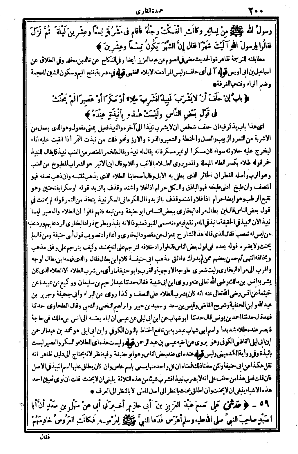 ثمَّ حسن بَعضهم مِمَّن لم يدْرك دقائق مَذْهَب أبي حنيفَة كَلَام ابْن بطال، فَقَالَ: وَالَّذِي فهمه ابْن بطال أوجه وَأقرب إِلَى مُرَاد البُخَارِيّ، وليت شعري مَا وَجه الأوجهية والقرب وَأَبُو حنيفَة مَا رأى من شرب الطلاء، إِلَّا الطلاء الَّذِي كَانَ يشربه أنس بن مَالك رَضِي الله تَعَالَى عَنهُ، وروى ابْن أبي شيبَة فَقَالَ: حَدثنَا عبد الرَّحِيم بن سُلَيْمَان ووكيع عَن عُبَيْدَة عَن خَيْثَمَة عَن أنس رَضِي الله تَعَالَى عَنهُ، أَنه كَانَ يشرب الطلاء على النّصْف، وَكَذَا: رُوِيَ عَن الْبَراء وَأبي جُحَيْفَة وَجَرِير بن عبد الله وَابْن الْحَنَفِيَّة وَشُرَيْح القَاضِي وَقيس بن سعد وَسَعِيد بن جُبَير وَإِبْرَاهِيم النَّخعِيّ وَالشعْبِيّ، وَقَالَ الطَّحَاوِيّ: حَدثنَا فَهد قَالَ: حَدثنَا أَحْمد بن يُونُس قَالَ: حَدثنَا أَبُو شهَاب عَن ابْن أبي ليلى عَن عِيسَى أَن أَبَاهُ بَعثه إِلَى أنس بن مَالك فِي حَاجَة فأبصر عِنْده طلاء شَدِيدا، وَاسم أبي شهَاب عبد ربه بن نَافِع الحناط بالنُّون الْكُوفِي، وَابْن أبي ليلى هُوَ مُحَمَّد بن عبد الرَّحْمَن بن أبي ليلى القَاضِي الْكُوفِي، وَهُوَ يرْوى عَن أَخِيه عِيسَى بن عبد الرَّحْمَن.
