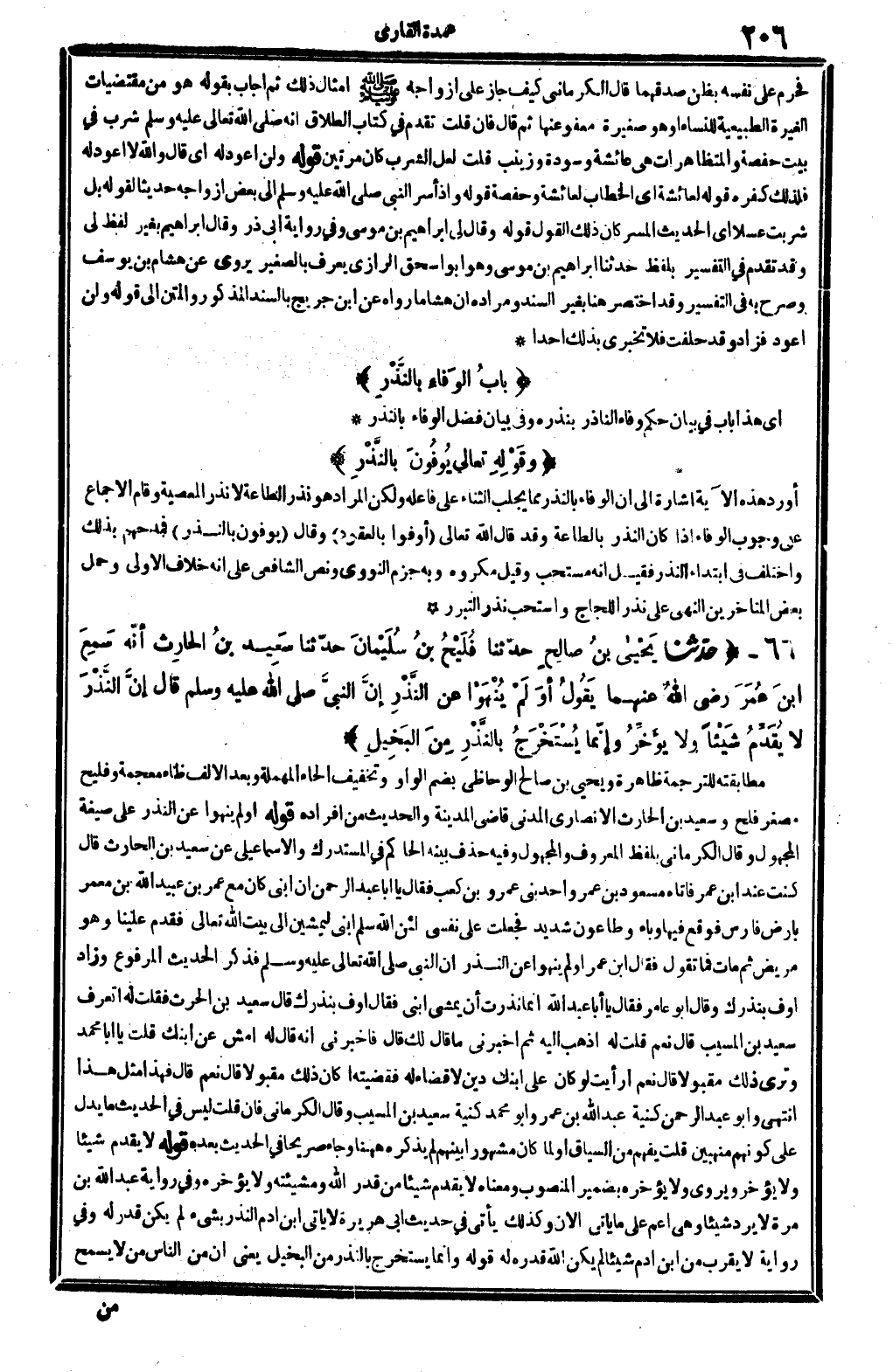 قَوْله: (أَو لم ينهوا عَن النّذر) على صِيغَة الْمَجْهُول. وَقَالَ الْكرْمَانِي بِلَفْظ الْمَعْرُوف والمجهول، وَفِيه حذف بَينه الْحَاكِم فِي (الْمُسْتَدْرك) : والإسماعيلي عَن سعيد بن الْحَارِث قَالَ: كنت عِنْد ابْن عمر فَأَتَاهُ مَسْعُود بن عَمْرو أحد بني عَمْرو بن كَعْب فَقَالَ: يَا أَبَا عبد الرَّحْمَن {إِن ابْني كَانَ مَعَ عمر بن عبيد الله بن معمر بِأَرْض فَارس، فَوَقع فِيهَا وباء وطاعون شَدِيد، فَجعلت على نَفسِي لَئِن الله سلم ابْني ليمشين إِلَى بَيت الله تَعَالَى، فَقدم علينا وَهُوَ مَرِيض ثمَّ مَاتَ، فَمَا تَقول؟ فَقَالَ ابْن عمر: أَو لم ينهوا عَن النّذر؟ إِن النَّبِي صلى الله عَلَيْهِ وَسلم ... فَذكر الحَدِيث الْمَرْفُوع، وَزَاد: أوف بِنَذْرِك، وَقَالَ أَبُو عَامر. فَقَالَ: يَا أَبَا عبد الله} إِنَّمَا نذرت أَن يمشي ابْني. فَقَالَ: أوف بِنَذْرِك، قَالَ سعيد بن الْحَارِث: فَقلت لَهُ: أتعرف سعيد بن الْمسيب؟ قَالَ: نعم. قلت لَهُ: إذهب إِلَيْهِ ثمَّ أَخْبرنِي مَا قَالَ لَك. قَالَ: فَأَخْبرنِي أَنه قَالَ لَهُ: امش عَن ابْنك.