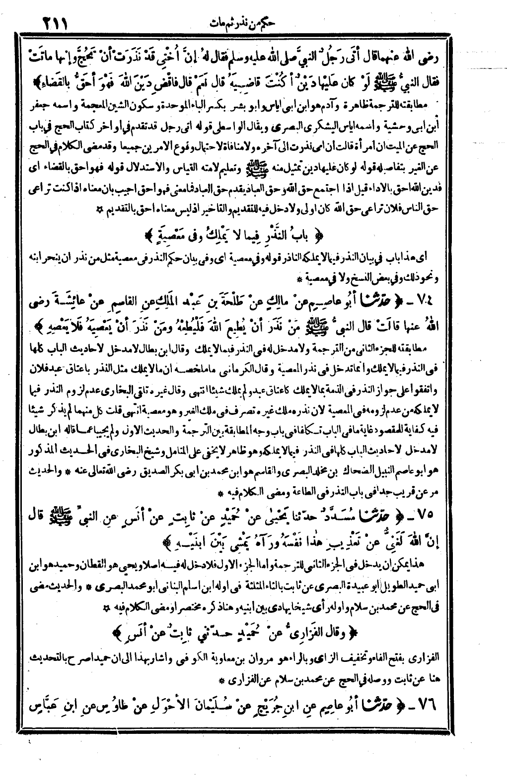 0076 - حدّثنا أبُو عَاصِمٍ عنْ مالِكٍ عنْ طَلْحَةَ بنِ عَبْد المَلِكِ عنِ القاسِمِ عنْ عائِشَةَ رَضِي الله عَنْهَا، قالَتْ: قَالَ النبيُّ صلى الله عَلَيْهِ وَسلم: (مَنْ نَذَرَ أنْ يُطِيعَ الله فَلْيُطِعْهُ، ومَنْ نَذَرَ أنْ يَعْصِيهَ فَلا يَعْصِهِ) . (انْظُر الحَدِيث 6966) .