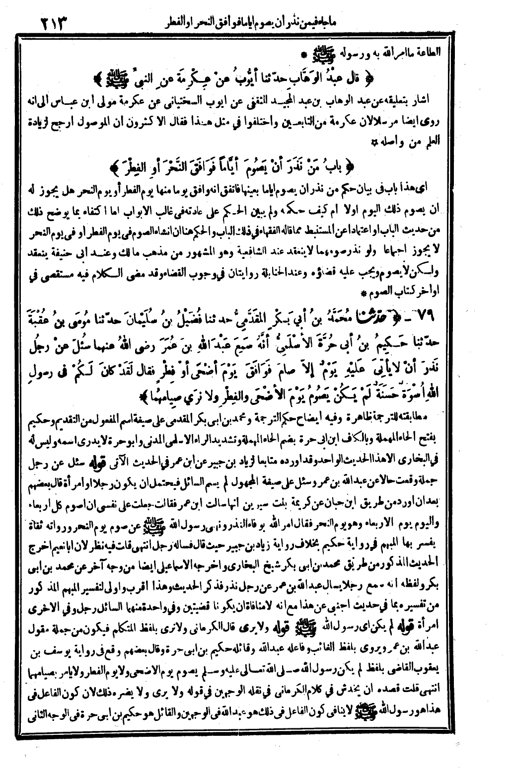 79 - (حَدثنَا مُحَمَّد بن أبي بكر الْمقدمِي حَدثنَا فُضَيْل بن سُلَيْمَان حَدثنَا مُوسَى بن عقبَة حَدثنَا حَكِيم بن أبي حرَّة الْأَسْلَمِيّ أَنه سمع عبد الله بن عمر رَضِي الله عَنْهُمَا سُئِلَ عَن رجل نذر أَن لَا يَأْتِي عَلَيْهِ يَوْم إِلَّا صَامَ فَوَافَقَ يَوْم أضحى أَو فطر فَقَالَ لقد كَانَ لكم فِي رَسُول الله أُسْوَة حَسَنَة لم يكن يَصُوم يَوْم الْأَضْحَى وَالْفطر وَلَا نرى صيامهما) مطابقته للتَّرْجَمَة ظَاهِرَة وَفِيه إِيضَاح حكم التَّرْجَمَة وَمُحَمّد بن أبي بكر الْمقدمِي على صِيغَة اسْم الْمَفْعُول من التَّقْدِيم وَحَكِيم بِفَتْح الْحَاء الْمُهْملَة وبالكاف ابْن أبي حرَّة بِضَم الْحَاء الْمُهْملَة وَتَشْديد الرَّاء الْأَسْلَمِيّ الْمدنِي وَأَبُو حرَّة لَا يدرى اسْمه وَلَيْسَ لَهُ فِي البُخَارِيّ إِلَّا هَذَا الحَدِيث الْوَاحِد وَقد أوردهُ مُتَابعًا لزياد بن جُبَير عَن ابْن عمر فِي الحَدِيث الْآتِي قَوْله سُئِلَ عَن رجل جملَة وَقعت حَالا عَن عبد الله بن عمر وَسُئِلَ على صِيغَة الْمَجْهُول لم يسم السَّائِل فَيحْتَمل أَن يكون رجلا أَو امْرَأَة قَالَ بَعضهم بعد أَن أورد من طَرِيق ابْن حبَان عَن كَرِيمَة بنت سِيرِين أَنَّهَا سَأَلت ابْن عمر فَقَالَت جعلت على نَفسِي أَن أَصوم كل أربعاء وَالْيَوْم يَوْم الْأَرْبَعَاء وَهُوَ يَوْم النَّحْر فَقَالَ أَمر الله بوفاء النّذر وَنهى رَسُول الله عَن صَوْم يَوْم النَّحْر وَرُوَاته ثِقَات يُفَسر بهَا الْمُبْهم فِي رِوَايَة حَكِيم بِخِلَاف رِوَايَة زِيَاد بن جُبَير حَيْثُ قَالَ فَسَأَلَهُ رجل انْتهى قلت فِيهِ نظر لِأَن أَبَا نعيم أخرج الحَدِيث الْمَذْكُور من طَرِيق مُحَمَّد بن أبي بكر شيخ البُخَارِيّ وَأخرجه الْإِسْمَاعِيلِيّ أَيْضا من وَجه آخر عَن مُحَمَّد بن أبي بكر وَلَفظه أَنه سمع رجلا يسْأَل عبد الله بن عمر عَن رجل نذر فَذكر الحَدِيث وَهَذَا أقرب وَأولى لتفسير الْمُبْهم الْمَذْكُور من تَفْسِيره بِمَا فِي حَدِيث أَجْنَبِي عَن هَذَا مَعَ أَنه لَا مُنَافَاة أَن يَكُونَا قضيتين وَفِي وَاحِدَة مِنْهُمَا السَّائِل رجل وَفِي الْأُخْرَى امْرَأَة قَوْله لم يكن أَي رَسُول الله - صَلَّى اللَّهُ عَلَيْهِ وَسَلَّم َ - قَوْله وَلَا يرى قَالَ الْكرْمَانِي وَلَا نرى بِلَفْظ الْمُتَكَلّم فَيكون من جملَة مقول عبد الله بن عمر ويروى بِلَفْظ الْغَائِب وفاعله عبد الله وقائله حَكِيم بن أبي حرَّة وَقَالَ بَعضهم وَقع فِي رِوَايَة يُوسُف بن يَعْقُوب القَاضِي بِلَفْظ لم يكن رَسُول الله - صَلَّى اللَّهُ عَلَيْهِ وَسَلَّم َ - يَصُوم يَوْم الْأَضْحَى وَلَا يَوْم الْفطر وَلَا يَأْمر بصيامهما انْتهى قلت قَصده أَن يخدش فِي كَلَام الْكرْمَانِي فِي نَقله الْوَجْهَيْنِ فِي قَوْله وَلَا يرى وَلَا يضرّهُ ذَلِك لِأَن كَون الْفَاعِل فِي هَذَا هُوَ رَسُول الله - صَلَّى اللَّهُ عَلَيْهِ وَسَلَّم َ - لَا يُنَافِي كَون الْفَاعِل فِي ذَلِك هُوَ عبد الله فِي الْوَجْهَيْنِ وَالْقَائِل هُوَ حَكِيم بن أبي حرَّة فِي الْوَجْه الثَّانِي