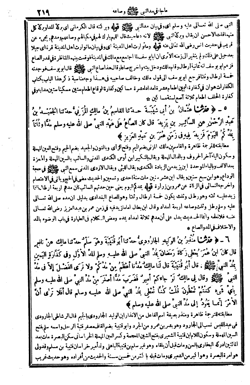 2176 - حدّثنا عُثْمانُ بنُ أبي شَيْبَةَ حدّثنا القاسِمُ بنُ مالِكٍ المُزَنِيُّ حَدثنَا الجُعَيْدُ بنُ عَبْدِ الرَّحْمانِ عنِ السَّائِبِ بنِ يَزِيدَ قَالَ: كَانَ الصَّاعُ عَلى عَهْدِ النبيِّ صلى الله عَلَيْهِ وَسلم مُدًّا وثُلُثاً بِمُدِّكُمُ اليَوْمَ، فَزِيدَ فِيهِ فِي زَمَنِ عُمَرَ بنِ عَبْدِ العَزِيزِ. (انْظُر الحَدِيث 9581 وطرفه) .
