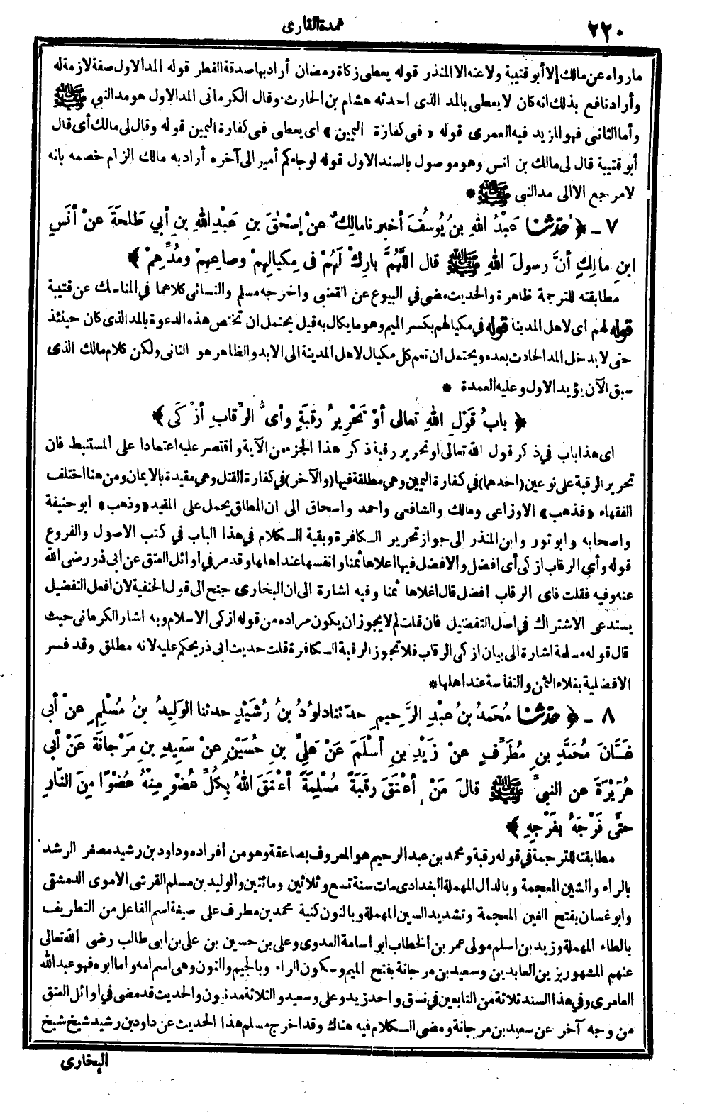 مطابقته للتَّرْجَمَة فِي (رَقَبَة) وَمُحَمّد بن عبد الرَّحِيم هُوَ الْمَعْرُوف بصاعقة وَهُوَ من أَفْرَاده، وَدَاوُد بن رشيد مصغر الرشد بالراء والشين الْمُعْجَمَة وبالدال الْمُهْملَة الْبَغْدَادِيّ مَاتَ سنة تسع وَثَلَاثِينَ وَمِائَتَيْنِ، والوليد بن مُسلم الْقرشِي الْأمَوِي الدِّمَشْقِي، وَأَبُو غَسَّان بِفَتْح الْغَيْن الْمُعْجَمَة وَتَشْديد السِّين الْمُهْملَة وبالنون كنية مُحَمَّد بن مطرف على صِيغَة اسْم الْفَاعِل من التطريف بِالطَّاءِ الْمُهْملَة، وَزيد بن أسلم مولى عمر بن الْخطاب أَبُو أُسَامَة الْعَدوي، وَعلي بن حُسَيْن بن عَليّ بن أبي طَالب رَضِي الله تَعَالَى عَنْهُم. الْمَشْهُور بزين العابدين، وَسَعِيد بن مرْجَانَة بِفَتْح الْمِيم وَسُكُون الرَّاء وبالجيم وَالنُّون وَهِي اسْم أمه، وَأما أَبوهُ فَهُوَ عبد الله العامري.