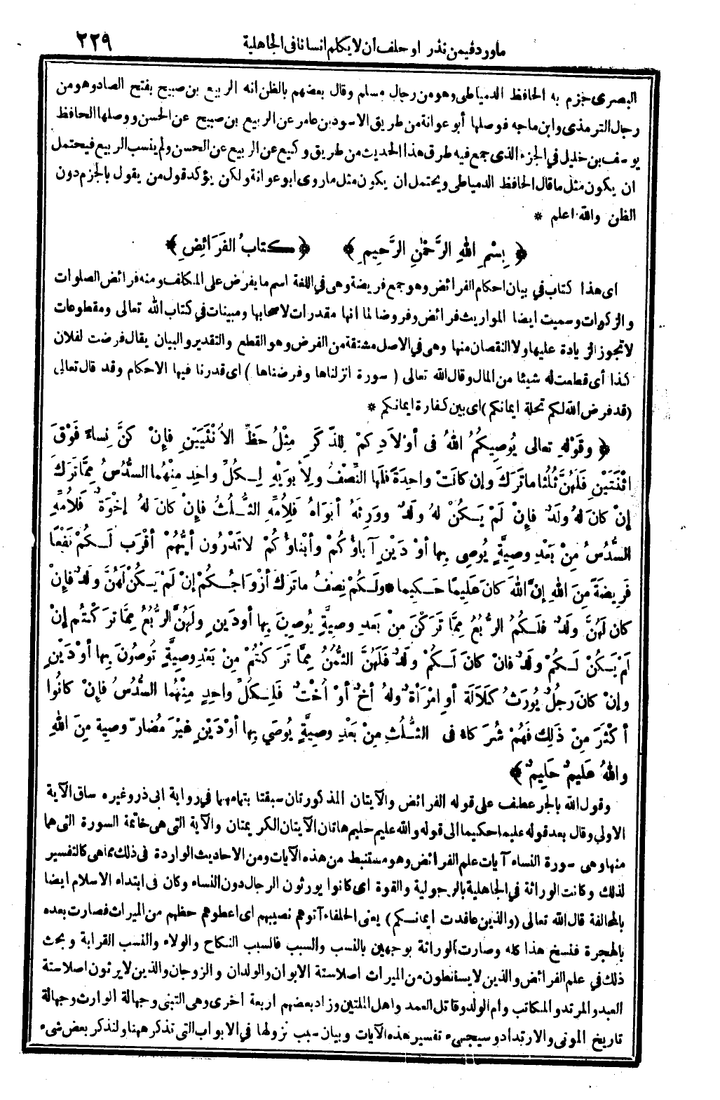 أَي: هَذَا كتاب فِي بَيَان أَحْكَام الْفَرَائِض، وَهُوَ جمع فَرِيضَة، وَهِي فِي اللُّغَة اسْم مَا يفْرض على الْمُكَلف، وَمِنْه فَرَائض الصَّلَوَات والزكوات، وَسميت أَيْضا الْمَوَارِيث فَرَائض وفروضاً لما أَنَّهَا مقدرات لأصحابها ومبينات فِي كتاب الله تَعَالَى ومقطوعات لَا تجوز الزِّيَادَة عَلَيْهَا وَلَا النُّقْصَان مِنْهَا، وَهِي فِي الأَصْل مُشْتَقَّة من الْفَرْض وَهُوَ الْقطع وَالتَّقْدِير وَالْبَيَان، يُقَال: فرضت لفُلَان كَذَا أَي: قطعت لَهُ شَيْئا من المَال. وَقَالَ الله تَعَالَى: {سُورَة أنزلناها وفرضناها} (النُّور: 1) أَي: قَدرنَا فِيهَا الْأَحْكَام، وَقد قَالَ تَعَالَى: {قد فرض الله لكم تَحِلَّة أَيْمَانكُم} (التَّحْرِيم: 2) أَي: بيَّن كَفَّارَة أَيْمَانكُم.