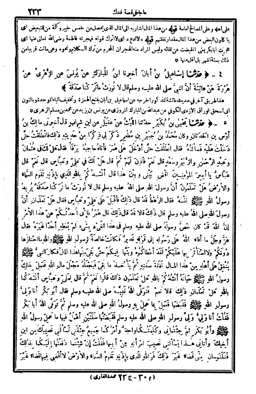 8276 - حدّثنا يَحْيَاى بنُ بُكَيْرٍ حدّثنا اللَّيْثُ عنْ عَقِيْلٍ عَن ابنِ شِهابٍ قَالَ: أَخْبرنِي مالِكُ بنُ أوْسِ بنِ الحَدَثانِ، وَكَانَ مُحَمَّدُ بنُ جُبَيْرِ بنِ مُطْعِمٍ ذَكَرَ لِي ذِكْراً مِنْ حَدِيثِهِ ذالِك، فانْطَلقْتُ حتَّى دَخَلْتُ عَلَيْه فَسألْتُهُ، فَقَالَ: انْطَلَقْتُ حتَّى أدْخُلَ على عُمَرَ فأتاهُ حاجِبُهُ يَرْفَأُ فَقَالَ: هَلْ لَكَ فِي عُثْمانَ وعَبْدِ الرَّحْمانِ والزُّبَيْرِ وسَعْدٍ؟ قَالَ: نَعَمْ، فأذِنَ لَهُمْ ثُمَّ قَالَ: هَلْ لَكَ فِي عَلِيٍّ وعَبَّاسٍ؟ قَالَ: نَعَمْ. قَالَ عَبَّاسٌ: يَا أميرَ المؤْمِنِينَ {اقْضه بَيْنِي وبيْنَ هاذا. قَالَ: أنْشدُكُمْ بِالله الّذِي بإذْنِهِ تَقُوم السَّماءُ والأرضُ، هَلْ تَعْلَمُونَ أنَّ رسولَ الله صلى الله عَلَيْهِ وَسلم قَالَ: (لَا نُورَثُ مَا تَرَكْنا صَدَقَةُ) يُرِيدُ رسولُ الله صلى الله عَلَيْهِ وَسلم نَفْسَهُ، فَقَالَ الرَّهْطُ: قَدْ قَالَ ذالِكَ، فأقْبَلَ عَلى عَلِيٍّ وعَبَّاسٍ فَقَالَ: هَلْ تَعْلَمانِ أنَّ رسولَ الله صلى الله عَلَيْهِ وَسلم قَالَ ذَلِكَ؟ قَالَا: قَدْ قَالَ ذَلِكَ. قَالَ عُمَرُ: فإنِّي أُحدِّثُكُمْ عنْ هاذا الأمْرِ، إنَّ الله قَدْ كَانَ خَصَّ رسولَهُ صلى الله عَلَيْهِ وَسلم فِي هاذا الفَيْءه بِشَيءٍ لَمْ يُعْطِهِ أحَداً غَيْرَهُ، فَقَالَ عَزَّ وجَلَّ: {مَا أَفَاء الله على رَسُوله} إِلَى قَوْلِهِ {قدير} (الْحَشْر: 6) فكانَتْ خالصَةَ لرسولِ الله صلى الله عَلَيْهِ وَسلم وَالله مَا احْتازَها دُونَكُمْ وَلَا اسْتَأْثَرَ بِها عَليْكُمْ، لَقَدْ أعْطاكُمُوهُ وبَثَّها فِيكُمْ حتَّى بَقِيَ مِنْها هاذا المالُ، فَكَانَ النبيُّ صلى الله عَلَيْهِ وَسلم يُنْفِقُ عَلى أهْلِهِ مِنْ هاذا المَال نَفَقَة سَنتِهِ ثُمَّ يَأْخُذُ مَا بَقِيَ فَيَجْعَلُهُ مَجْعَلَ مالِ الله، فَعَمِلَ بِذَلِكَ رسولُ الله صلى الله عَلَيْهِ وَسلم حَياتَهُ، أنْشُدُكُمْ بِاللَّه} هَلْ تَعْلَمُون ذالِكَ؟ قالُوا: نَعَمْ. ثُمَّ قَالَ لِعَليٍّ وعَبَّاسٍ: أنْشدُكُما بِاللَّه! هَلْ تَعْلَمانِ ذالِك؟ قَالَا: نَعمْ. فَتَوفَّى الله نَبِيِّهُ صلى الله عَلَيْهِ وَسلم فَقَالَ أبُو بَكْر: أَنا وَلِيُّ رسولِ الله صلى الله عَلَيْهِ وَسلم، فَقَبَضَها فَعَمِلَ بِما عَمِلَ بِهِ رسولُ الله صلى الله عَلَيْهِ وَسلم، ثُمَّ تَوَفَّى الله أَبَا بَكْر، فَقُلْتُ: أَنا وَلِيُّ وَلِيِّ رسولِ الله صلى الله عَلَيْهِ وَسلم، فَقَبَضْتُها سَنَتَيْنِ أعْمَلُ فِيهَا مَا عَمِلَ رسولُ الله صلى الله عَلَيْهِ وَسلم وأبُو بَكْرٍ، ثمَّ جِئتُمانِي وكَلِمَتُكُما واحِدٌ وأمْرُكُما جَمِيعٌ، جِئتَنِي تَسْألُنِي نَصِيبَكَ مِن ابنِ أخِيكَ. وأتانِي هاذا يَسْألنِي نَصِيبَ امْرأتِهِ مِنْ أبِيها، فَقُلْتُ: إنْ شِئْتُما دَفَعْتُها إلَيْكُما بِذالِكَ، فَتَلْتَمِسانِ مِنِّي قَضاءً غَيْرَ ذالِكَ فَوَالله الّذِي بإذْنِهِ تَقُومُ السَّماءُ والأرْضُ لَا أقْضِي فِيها قَضاءً غَيْرَ
