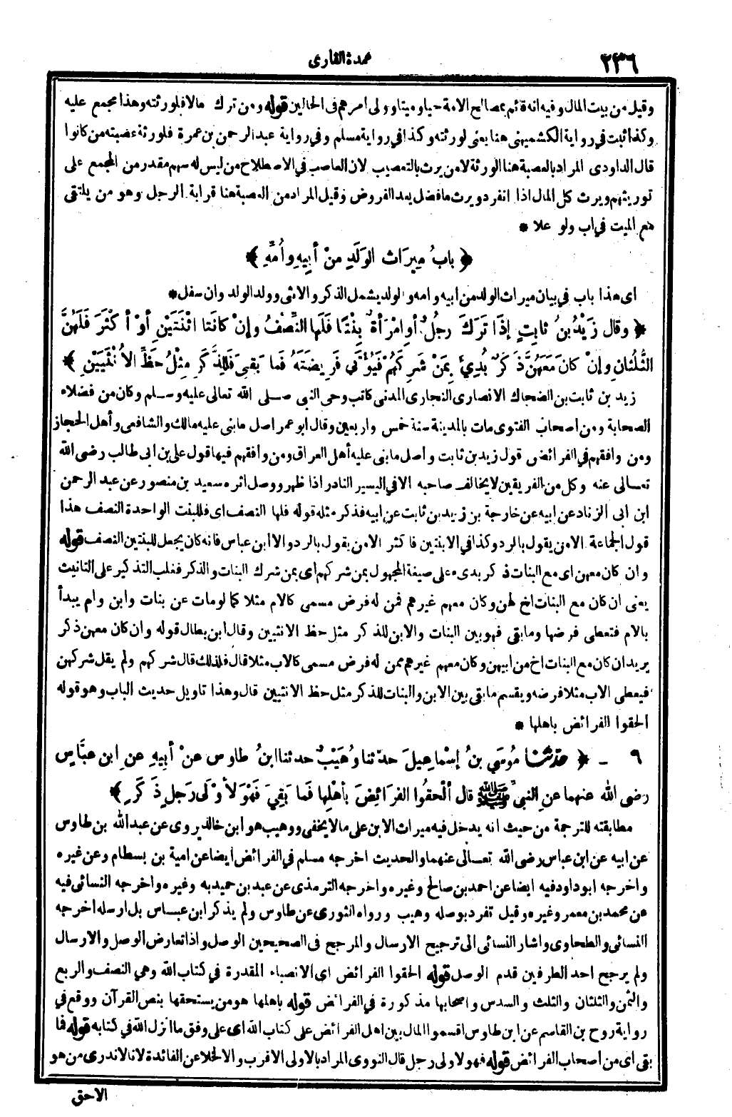2376 - حدّثنا مُوسَى بنُ إسْماعِيلَ حدّثنا وُهَيْبٌ حَدثنَا ابنُ طَاوُوس عنْ أبِيهِ عَن ابْن عبَّاسٍ رَضِي الله عَنْهُمَا، عنِ النبيِّ صلى الله عَلَيْهِ وَسلم قَالَ: (ألْحَقُوا الفَرائِضَ بأهْلِها، فَمَا بَقِيَ فَهْوَ لأوْلَى رَجلٍ ذَكَرٍ) .