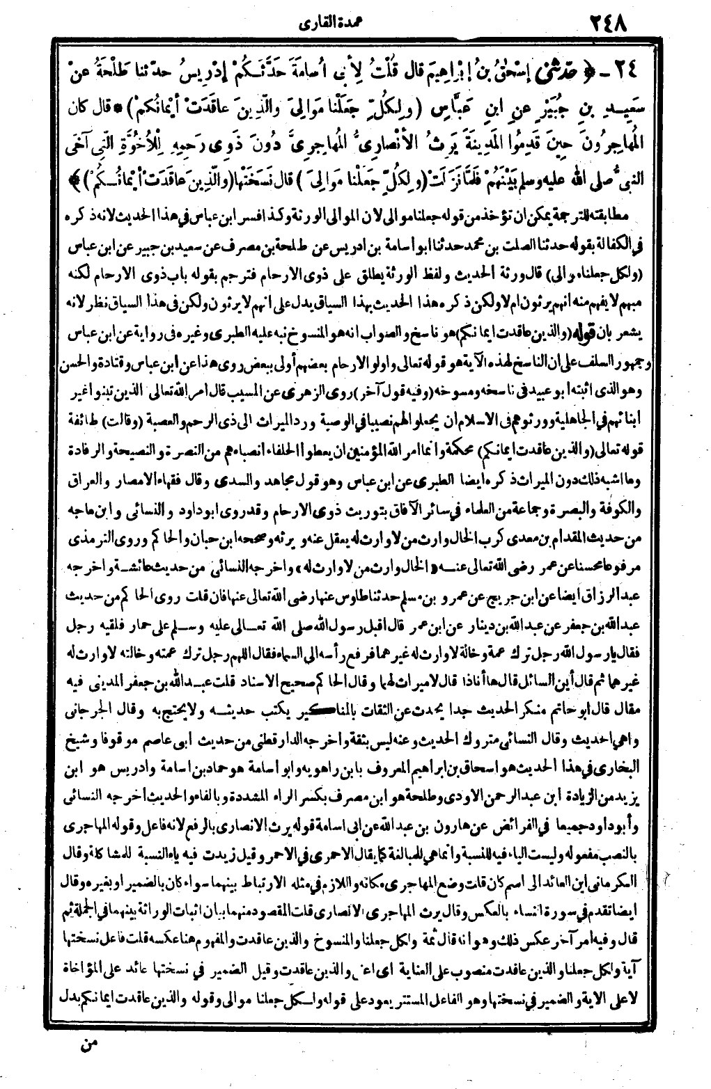 7476 - حدّثني إسْحَاقُ بنُ إبْراهِيمَ قَالَ: قُلْتُ ل أبي أُسامَةَ: حَدَّثَكُمْ إدْرِيسُ حدّثنا طَلْحَةُ عنْ سَعِيدِ بنِ جُبَيْرٍ عنِ ابنِ عَبَّاسٍ: {وَلكُل جعلنَا موالى وَالَّذين عاقلت أَيْمَانكُم} (النِّسَاء: 33) قَالَ: كَانَ المُهاجِرُونَ حِينَ قَدِمُوا المَدِينَةَ يَرِثُ الأنْصارِيُّ المُهاجِرِيُّ دُونَ ذَوِي رَحِمِهِ لْلأُخُوَّةِ الّتِي آخَى النبيُّ صلى الله عَلَيْهِ وَسلم، بَيْنَهُمْ فَلَمَّا نَزَلَتْ {وَلكُل جعلنَا موالى} قَالَ: نَسَخَتْها: {وَالَّذين عقدت أَيْمَانكُم} .