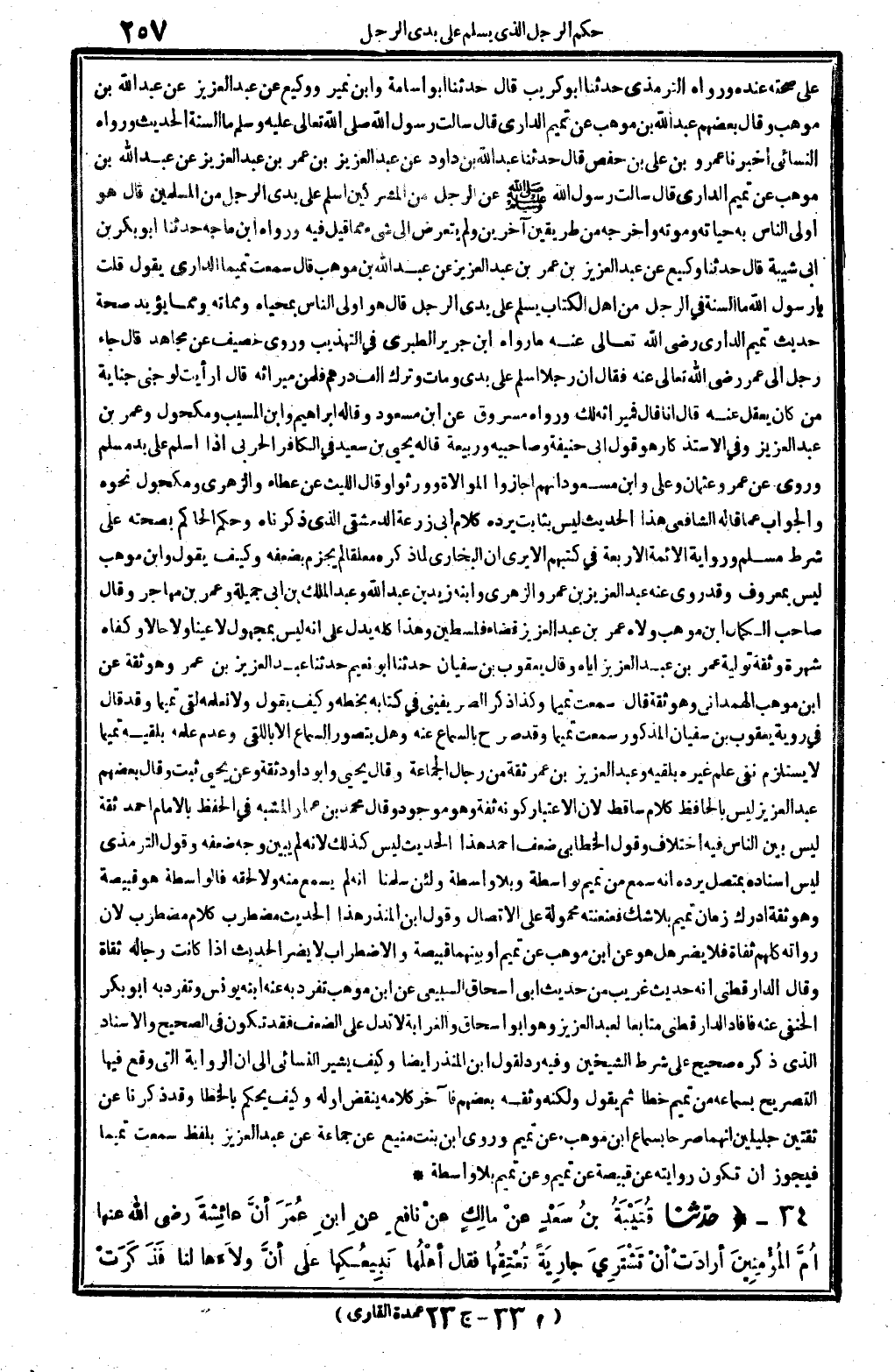 وَكَيف يَقُول: وَلَا نعلمهُ لَقِي تميماً وَقد قَالَ فِي رِوَايَة يَعْقُوب بن سُفْيَان الْمَذْكُور: سَمِعت تميماً، وَقد صرح بِالسَّمَاعِ عَنهُ، وَهل يتَصَوَّر السماع إلاَّ باللقى؟ وَعدم علمه بلقيه تميماً لَا يسْتَلْزم نفي علم غَيره بلقيه، وَعبد الْعَزِيز بن عمر ثِقَة من رجال الْجَمَاعَة، وَقَالَ يحيى وَأَبُو دَاوُد: ثِقَة، وَعَن يحيى: ثَبت، وَقَالَ بَعضهم: عبد الْعَزِيز لَيْسَ بِالْحَافِظِ كَلَام سَاقِط، لِأَن الِاعْتِبَار كَونه ثِقَة وَهُوَ مَوْجُود. وَقَالَ مُحَمَّد بن عمار: الْمُشبه فِي الْحِفْظ بِالْإِمَامِ أَحْمد ثِقَة لَيْسَ بَين النَّاس فِيهِ اخْتِلَاف، وَقَول الْخطابِيّ: ضعف أَحْمد هَذَا الحَدِيث، لَيْسَ كَذَلِك، لِأَنَّهُ لم يبين وَجه ضعفه. وَقَول التِّرْمِذِيّ: لَيْسَ إِسْنَاده بِمُتَّصِل، يردهُ أَنه سمع من تَمِيم بِوَاسِطَة وَبلا وَاسِطَة، وَلَئِن سلمنَا أَنه لم يسمع مِنْهُ وَلَا لحقه فالواسطة هُوَ قبيصَة وَهُوَ ثِقَة أدْرك زمَان تَمِيم بِلَا شكّ، فعنعنته مَحْمُولَة على الِاتِّصَال. وَقَول ابْن الْمُنْذر: هَذَا الحَدِيث مُضْطَرب، كَلَام مُضْطَرب لِأَن رُوَاته كلهم ثقاة فَلَا يضر هَل هُوَ عَن ابْن موهب عَن تَمِيم أَو بَينهمَا قبيصَة؟ وَالِاضْطِرَاب لَا يضر الحَدِيث إِذا كَانَت رِجَاله ثقاة.