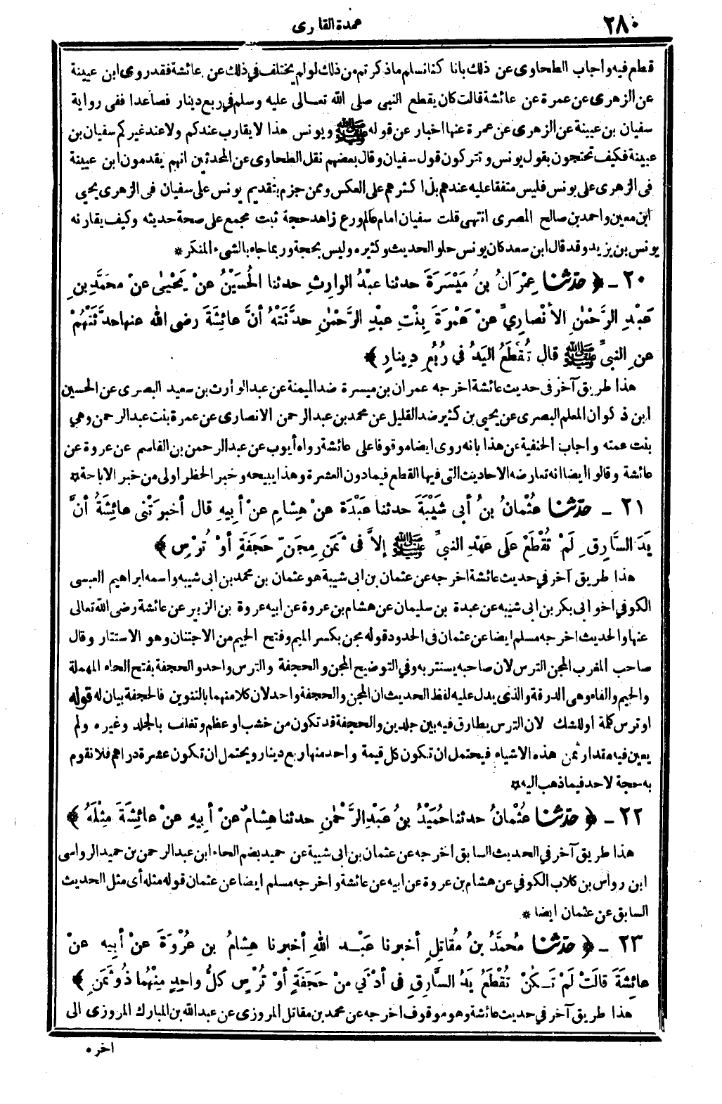 هَذَا طَرِيق آخر فِي حَدِيث عَائِشَة أخرجه عمرَان بن ميسرَة ضد الميمنة عَن عبد الْوَارِث بن سعيد الْبَصْرِيّ عَن الْحُسَيْن ابْن ذكْوَان الْمعلم الْبَصْرِيّ عَن يحيى بن كثير ضد الْقَلِيل عَن مُحَمَّد بن عبد الرَّحْمَن الْأنْصَارِيّ عَن عمْرَة بنت عبد الرَّحْمَن، وَهِي بنت عمته. وَأجَاب الْحَنَفِيَّة عَن هَذَا بِأَنَّهُ روى أَيْضا مَوْقُوفا على عَائِشَة، رَوَاهُ أَيُّوب عَن عبد الرَّحْمَن بن الْقَاسِم عَن عُرْوَة عَن عَائِشَة، وَقَالُوا أَيْضا: إِنَّه تعارضه الْأَحَادِيث الَّتِي فِيهَا الْقطع فِيمَا دون الْعشْرَة، وَهَذَا يبيحه، وَخبر الْحَظْر أولى من خبر الْإِبَاحَة.