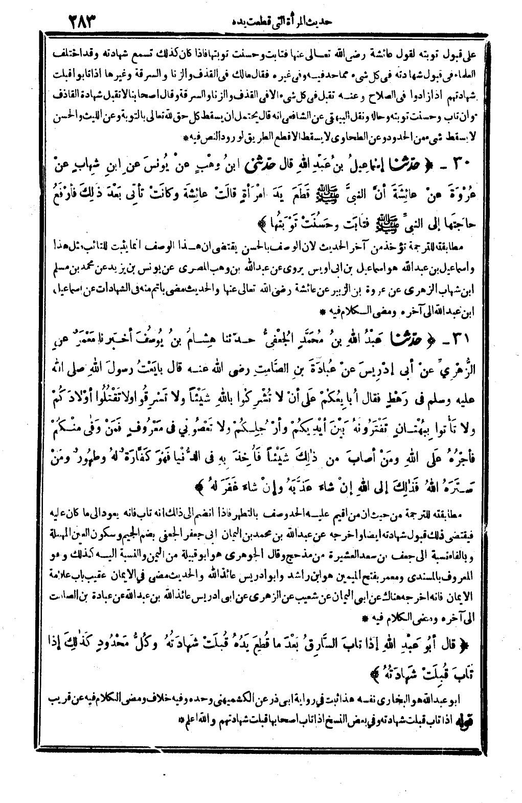 0086 - حدّثنا إسْماعِيلُ بنُ عَبْدِ الله قَالَ: حدّثني ابنُ وهْبٍ عنْ يُونسَ عنِ ابنِ شِهابٍ عنْ عُرْوَةَ عنْ عائِشَةَ أنَّ النبيَّ صلى الله عَلَيْهِ وَسلم قَطَعَ يَدَ امْرأةٍ، قالَتْ عائِشَةَ وكانَتْ تأتِي بَعْدَ ذلِكَ فأرْفَعُ حاجَتَها إِلَى النبيِّ صلى الله عَلَيْهِ وَسلم، فتابَتْ وحَسُنَتْ تَوْبَتُها.