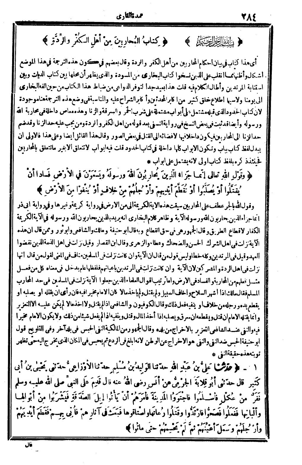 وَقَول الله: بِالْجَرِّ عطف على الْمُحَاربين، سيقت هَذِه الْآيَة الْكَرِيمَة إِلَى {من الأَرْض} فِي رِوَايَة كَرِيمَة وَغَيرهَا، وَفِي رِوَايَة أبي ذَر {إِنَّمَا جَزَاء الَّذين يُحَاربُونَ الله وَرَسُوله} . . الْآيَة. وَظَاهر كَلَام البُخَارِيّ أَنه يُرِيد بالذين يُحَاربُونَ الله وَرَسُوله فِي الْآيَة الْكَرِيمَة الْكفَّار لَا قطاع الطَّرِيق. وَقَالَ الْجُمْهُور: هِيَ فِي حق القطاع، وَبِه قَالَ أَبُو حنيفَة وَمَالك وَالشَّافِعِيّ وَأَبُو ثَوْر، وَمِمَّنْ قَالَ: إِن هَذِه الْآيَة نزلت فِي أهل الشّرك: الْحسن وَالضَّحَّاك وَعَطَاء وَالزهْرِيّ، وَقَالَ ابْن الْقصار: وَقيل: نزلت فِي أهل الذِّمَّة الَّذين نقضوا الْعَهْد، وَقيل: فِي الْمُرْتَدين، وَكله خطأ، وَلَيْسَ قَول من قَالَ: إِن الْآيَة، وَإِن كَانَت نزلت فِي الْمُسلمين، منَاف فِي الْمَعْنى لقَوْل من قَالَ: إِنَّهَا نزلت فِي أهل الرِّدَّة وَالْمُشْرِكين، لِأَن الْآيَة، وَإِن كَانَت نزلت فِي الْمُرْتَدين بأعيانهم فلفظها عَام يدْخل فِي مَعْنَاهُ كل من فعل مثل فعلهم من الْمُحَاربَة وَالْفساد فِي الأَرْض.