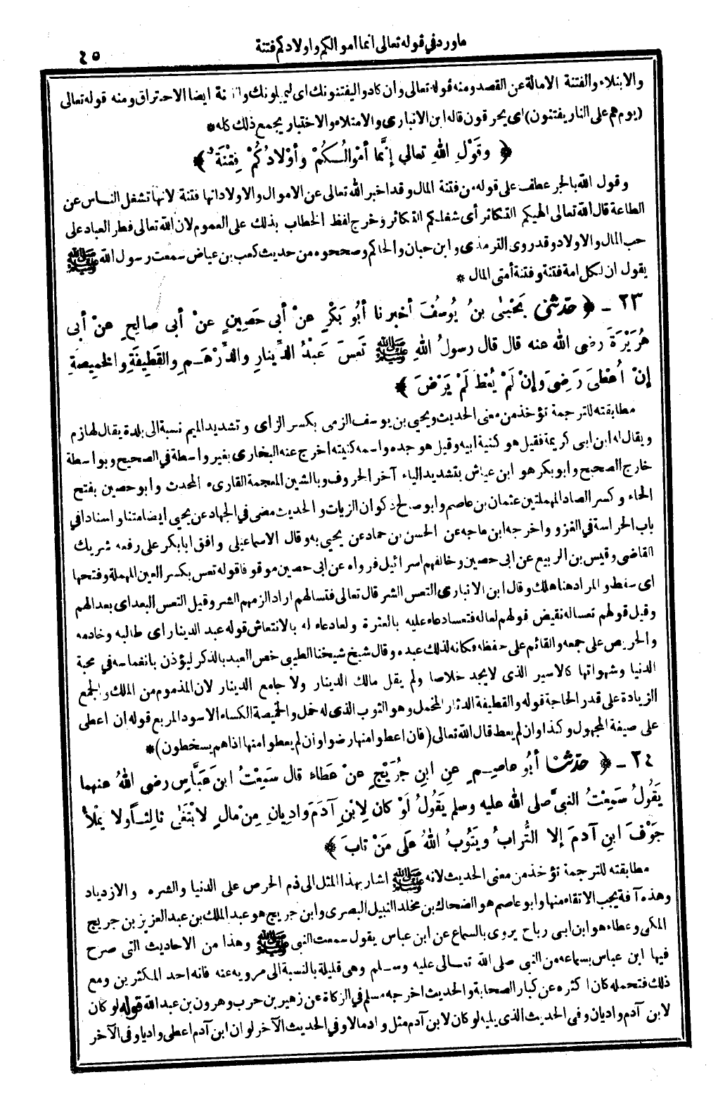 24 - (حَدثنَا أَبُو عَاصِم عَن ابْن جريج عَن عَطاء قَالَ سَمِعت ابْن عَبَّاس رَضِي الله عَنْهُمَا يَقُول سَمِعت النَّبِي - صَلَّى اللَّهُ عَلَيْهِ وَسَلَّم َ - يَقُول لَو كَانَ لِابْنِ آدم واديان من مَال لابتغى ثَالِثا وَلَا يمْلَأ جَوف ابْن آدم إِلَّا التُّرَاب وَيَتُوب الله على من تَابَ) مطابقته للتَّرْجَمَة تُؤْخَذ من معنى الحَدِيث لِأَنَّهُ - صَلَّى اللَّهُ عَلَيْهِ وَسَلَّم َ - أَشَارَ بِهَذَا الْمثل إِلَى ذمّ الْحِرْص على الدُّنْيَا والشره والازدياد وَهَذِه آفَة يجب الاتقاء مِنْهَا وَأَبُو عَاصِم هُوَ الضَّحَّاك بن مخلد النَّبِيل الْبَصْرِيّ وَابْن جريج هُوَ عبد الْملك بن عبد الْعَزِيز بن جريج الْمَكِّيّ وَعَطَاء هُوَ ابْن أبي رَبَاح يروي بِالسَّمَاعِ عَن ابْن عَبَّاس يَقُول سَمِعت النَّبِي - صَلَّى اللَّهُ عَلَيْهِ وَسَلَّم َ - وَهَذَا من الْأَحَادِيث الَّتِي صرح فِيهَا ابْن عَبَّاس بِسَمَاعِهِ من النَّبِي - صَلَّى اللَّهُ عَلَيْهِ وَسَلَّم َ - وَهِي قَليلَة بِالنِّسْبَةِ إِلَى مرويه عَنهُ فَإِنَّهُ أحد المكثرين وَمَعَ ذَلِك فتحمله كَانَ أَكْثَره عَن كبار الصَّحَابَة والْحَدِيث أخرجه مُسلم فِي الزَّكَاة عَن زُهَيْر بن حَرْب وَهَارُون بن عبد الله قَوْله لَو كَانَ لِابْنِ آدم واديان وَفِي الحَدِيث يَلِيهِ لَو كَانَ لِابْنِ آدم مثل وَاد مَالا وَفِي الحَدِيث الآخر لَو أَن ابْن آدم أعطي وَاديا وَفِي الآخر