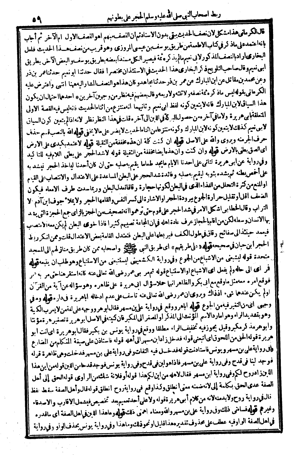 قلت: وَمِمَّنْ أنكر ربط الْحجر ابْن حبَان فِي (صَحِيحه) : قَوْله: (على طريقهم) أَي: طَرِيق النَّبِي صلى الله عَلَيْهِ وَسلم وَأَصْحَابه مِمَّن كَانَ طَرِيق مَنَازِلهمْ إِلَى الْمَسْجِد متحدة. قَوْله: (ليشبعني) من الإشباع من الْجُوع، وَفِي رِوَايَة الْكشميهني: ليستتبعني، من الاستتباع وَهُوَ طلب أَن يتبعهُ. قَوْله: (فَمر) أَي: إِلَى حَاله وَلم يفعل أَي: الإشباع أَو الاستتباع. قَوْله: (ثمَّ مر بِي عمر رَضِي الله تَعَالَى عَنهُ) كَأَنَّهُ اسْتَقر هُنَا حَتَّى مر بِهِ عمر فَوَقع أمره مَعَه مثل مَا وَقع مَعَ أبي بكر، وَالظَّاهِر أَنَّهُمَا حملا سُؤال أبي هُرَيْرَة على ظَاهره، وَهُوَ سُؤَاله عَن آيَة من الْقُرْآن، أَو لم يكن عِنْدهمَا شَيْء إِذْ ذَاك، ويروى أَن عمر رَضِي الله تَعَالَى عَنهُ، تأسف على عدم إِدْخَاله أَبَا هُرَيْرَة فِي دَاره. قَوْله: (وَمَا فِي وَجْهي) أَي: من التَّغَيُّر فِيهِ من الْجُوع. قَوْله: (أباهر) وَوَقع فِي رِوَايَة عَليّ بن مسْهر فَقَالَ أَبُو هر، وَوَجهه على لُغَة من لَا يعرب الكنية وَهُوَ بتَشْديد الرَّاء وَهُوَ إِمَّا رد الِاسْم الْمُؤَنَّث إِلَى الْمُذكر أَو المصغر إِلَى المكبر فَإِن كنيته فِي الأَصْل: أَبُو هُرَيْرَة تَصْغِير هرة مؤنثاً. وَأَبُو هر مُذَكّر مكبر، وَقيل: يجوز فِيهِ تَخْفيف الرَّاء مُطلقًا، وَوَقع فِي رِوَايَة يُونُس بن بكير فَقَالَ: أَبُو هُرَيْرَة، أَي: أَنْت أَبُو هُرَيْرَة. قَوْله: (إلحق) من اللحوق أَي: اتبعني قَوْله: (فَدخل) زَاد ابْن مسْهر: إِلَى أَهله، قَوْله: (فَاسْتَأْذن) على صِيغَة الْمُتَكَلّم من الْمُضَارع وَفِي رِوَايَة عَليّ بن مسْهر وَيُونُس: فأستادنت. قَوْله: (فَدخل) فِيهِ الْتِفَات، وَفِي رِوَايَة عَليّ بن مسْهر فَدخلت، وَهِي ظَاهِرَة. قَوْله: (فَوجدَ لَبَنًا فِي قدح) وَفِي رِوَايَة عَليّ بن مسْهر: فَإِذا هُوَ لبن فِي قدح، وَفِي رِوَايَة يُونُس: فَوجدَ قدحاً من اللَّبن. قَوْله: (من أَيْن هَذَا اللَّبن) زَاد روح: لكم، وَفِي رِوَايَة ابْن مسْهر: فَقَالَ لأَهله: من أَيْن لكم هَذَا؟ قَوْله: (أَو فُلَانَة) شكّ من الرَّاوِي. قَوْله: (إلحق إِلَى أهل الصّفة) عدى: إلحق، بِكَلِمَة: إِلَى لِأَنَّهُ ضمنه معنى: انْطلق. وَكَذَا وَقع فِي رِوَايَة روح: انْطلق. قَوْله: (قَالَ: وَأهل الصّفة) سقط لفظ قَالَ فِي رِوَايَة روح، وَلَا بُد مِنْهُ لِأَنَّهُ من كَلَام أبي هُرَيْرَة. قَوْله: (وَلَا على أحد) تَعْمِيم بعد تَخْصِيص فَيشْمَل الْأَقَارِب والأصدقاء وَغَيرهم. قَوْله: (فساءني ذَلِك) وَفِي رِوَايَة عَليّ بن مسْهر: وَالله، وَمَعْنَاهُ أهمني ذَلِك. قَوْله: (وَمَا هَذَا اللَّبن فِي أهل الصّفة) ؟ أَي: مَا قدره فِي أهل الصّفة؟ الْوَاو فِيهِ عطف على مَحْذُوف تَقْدِيره: هَذَا قَلِيل أَو نَحْو ذَلِك، وَمَا هَذَا؟ وَفِي رِوَايَة يُونُس بِحَذْف الْوَاو، وَفِي رِوَايَة