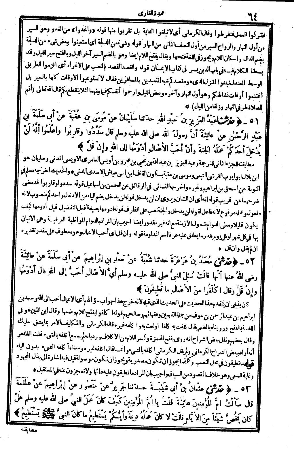 4646 - حدّثنا عَبْدُ العَزِيزُ بنُ عَبْدِ الله حدّثنا سُلَيْمانُ عنْ مُوسَى بنِ عُقْبَةَ عنْ أبي سَلَمَة بنِ عَبْدِ الرَّحْمانِ عنْ عائِشَةَ: أنَّ رسولَ الله صلى الله عَلَيْهِ وَسلم قَالَ: (سَدِّدُوا وقارِبُوا واعْلَمُوا أنَّهُ لَنْ يُدْخِلَ أحَدَكُمْ عَمَلُهُ الجَنةَ، وأنَّ أحَبَّ الأعْمالِ أدْوَمُها إِلَى الله وإنْ قَلَّ) . (الحَدِيث 4646 طرفه فِي: 7646) .