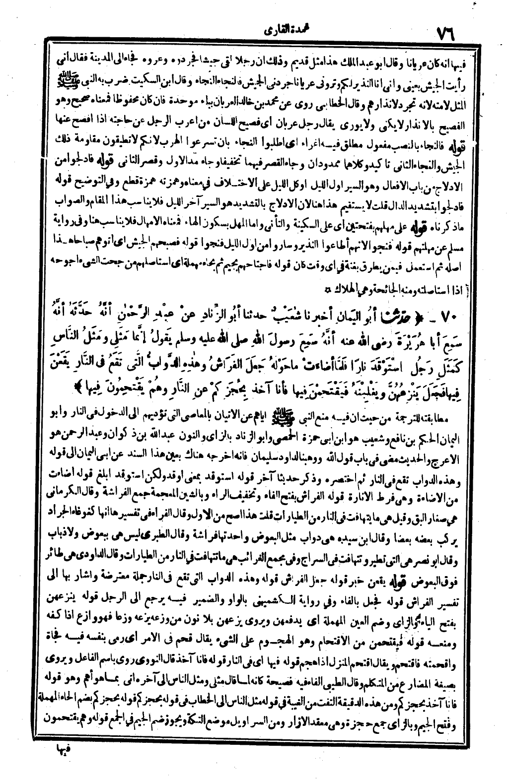 فِيهَا أَنه كَانَ عُريَانا. وَقَالَ أَبُو عبد الْملك: هَذَا مثل قديم، وَذَلِكَ أَن رجلا لَقِي جَيْشًا فجردوه وعروه، فجَاء إِلَى الْمَدِينَة فَقَالَ: إِنِّي رَأَيْت الْجَيْش بعيني وَإِنِّي أَنا النذير لكم وتروني عُريَانا جردني الْجَيْش فالنجاء النَّجَاء، وَقَالَ ابْن السّكيت: ضرب بِهِ النَّبِي صلى الله عَلَيْهِ وَسلم الْمثل لأمته لِأَنَّهُ تجرد لإنذارهم. وَقَالَ الْخطابِيّ: رُوِيَ عَن مُحَمَّد بن خَالِد: العربان، بباء مُوَحدَة فَإِن كَانَ مَحْفُوظًا فَمَعْنَاه صَحِيح وَهُوَ الفصيح بالإنذار لَا يكنى وَلَا يورى، يُقَال: رجل عربان أَي: فصيح اللِّسَان، من: أعرب الرجل عَن حَاجته إِذا أفْصح عَنْهَا. قَوْله: (فالنجاء) بِالنّصب مفعول مُطلق فِيهِ إغراء أَي: اطْلُبُوا النَّجَاء بِأَن تسرعوا الْهَرَب لأنكم لَا تطيقون مقاومة ذَلِك الْجَيْش، (والنجاء) الثَّانِي تَأْكِيد وَكِلَاهُمَا ممدودان، وَجَاء الْقصر فيهمَا تَخْفِيفًا وَجَاء مد الأول وَقصر الثَّانِي. قَوْله: (فأدلجوا) من الإدلاج من بَاب الإفعال وَهُوَ السّير أول اللَّيْل، أَو كل اللَّيْل على الِاخْتِلَاف فِي مَعْنَاهُ، وهمزته همزَة قطع، وَفِي (التَّوْضِيح) : قَوْله: (فأدلجوا) بتَشْديد الدَّال قلت لَا يَسْتَقِيم هَذَا هُنَا لِأَن الادلاج بِالتَّشْدِيدِ هُوَ السّير آخر اللَّيْل فَلَا يُنَاسب هَذَا الْمقَام وَالصَّوَاب مَا ذَكرْنَاهُ قَوْله: (على مهلهم) بِفتْحَتَيْنِ أَي: على السكينَة والتأني، وَأما الْمهل بِسُكُون الْهَاء فَمَعْنَاه الْإِمْهَال فَلَا يُنَاسب هُنَا، وَفِي رِوَايَة مُسلم عَن مهلتهم، قَوْله: (فنجوا) لأَنهم أطاعوا النذير وَسَارُوا من أول اللَّيْل فنجوا. قَوْله: (فصبحهم الْجَيْش) أَي: أتوهم صباحاً، هَذَا أَصله ثمَّ اسْتعْمل فِيمَن يطْرق بَغْتَة فِي أَي وَقت كَانَ. قَوْله: (فاجتاحهم) بجيم ثمَّ بحاء مُهْملَة أَي: استأصلهم، من جحت الشَّيْء أجوحه إِذا استأصلته، وَمِنْه الْجَائِحَة وَهِي الْهَلَاك.
