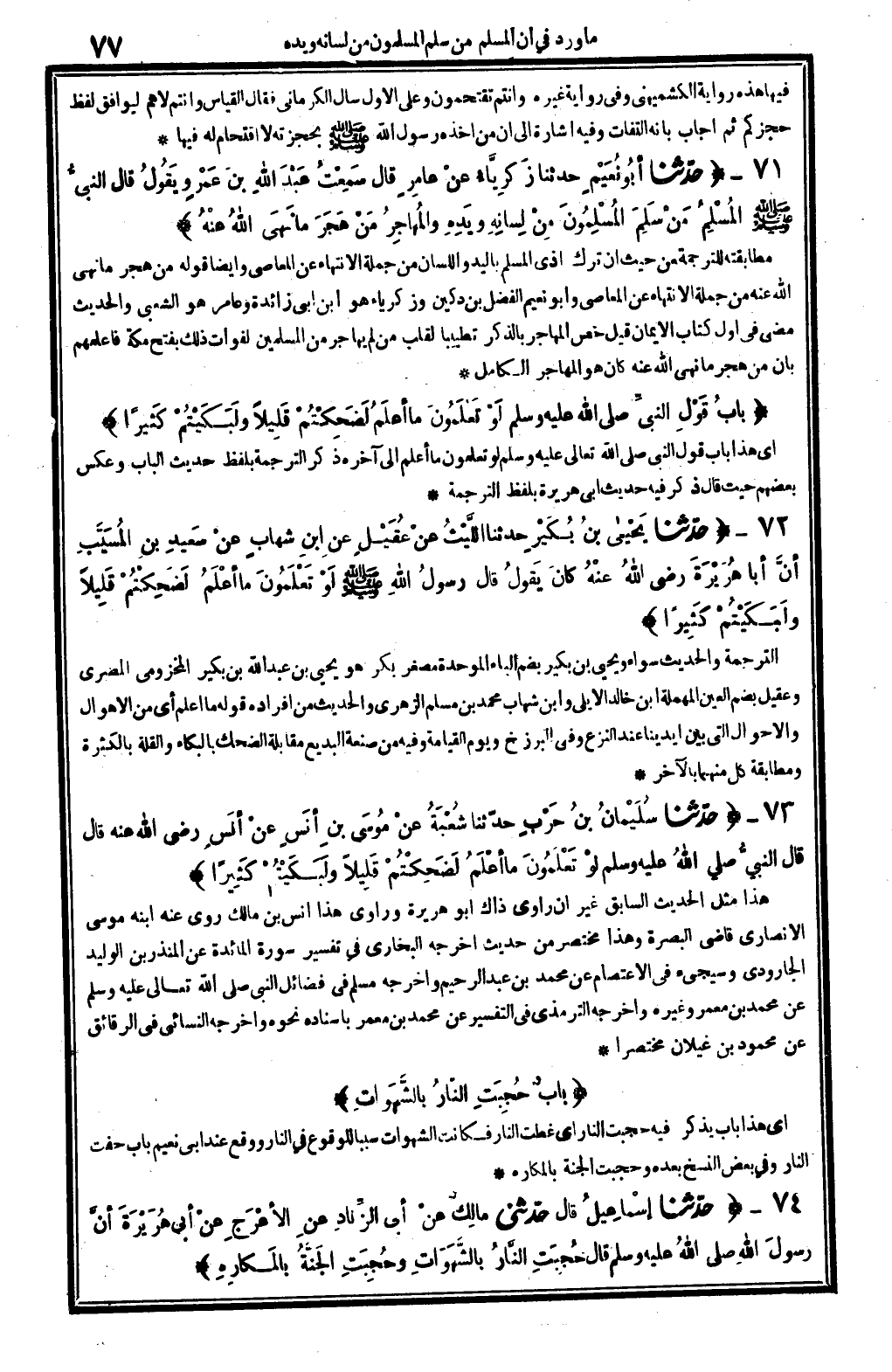 4846 - حدّثنا أبُو نُعَيْمٍ حَدثنَا زَكرِيَّاءُ عنْ عامِرٍ قَالَ: سَمِعْتُ عَبْدَ الله بنَ عَمْرٍ ويَقُولُ: قَالَ النبيُّ صلى الله عَلَيْهِ وَسلم: (المُسْلِمُ مَنْ سَلِمَ المُسْلِمُونَ منْ لِسانِهِ ويَدِهِ، والمُهاجِرُ مَنْ هَجَرَ مَا نَهَى الله عنْهُ) .