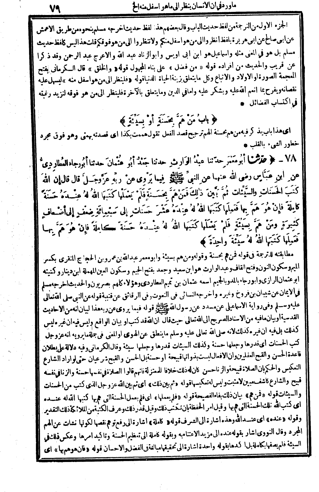 1946 - حدّثنا أبُو مَعْمَرٍ حدّثنا عبْدُ الوَارِثِ حَدثنَا جَعْدٌ أبُو عُثْمانَ حَدثنَا أبُو رجاءٍ العُطارِدِيُّ عنِ ابنِ عَبَّاسٍ رَضِي الله عَنْهُمَا، عَن النبيِّ صلى الله عَلَيْهِ وَسلم فِيما يَرْوِي عنْ ربِّهِ عَزَّ وجَلَّ، قَالَ: (قَالَ إنَّ الله كَتَبَ الحَسَناتِ والسَّيِّئات ثُمَّ بَيَّنَ ذالِكَ، فَمَنْ هَمَّ بِحَسَنَةٍ فَلَمْ يَعْمَلْها كَتَبَها الله لهُ عِنْدهُ حَسَنَةً كامِلَةً، فإنْ هُوَ هَمَّ بِها فَعَمِلَها كَتَبَها الله لهُ عِنْدَهُ عَشْرَ حَسَناتٍ إِلَى سَبْعِمِائَةِ ضِعْفٍ إِلَى أضْعَافٍ كَثِيرَةٍ، ومَنْ هَمَّ بِسَيِّئَةٍ فَلمْ يَعْمَلِها كَتَبَها الله لهُ عِنْدَهُ حَسَنَةً كامِلَةً، فإنْ هُوَ هَمَّ بِها فَعَمِلَها كَتَبَها الله لهُ سَيِّئَةً واحِدَةً) .