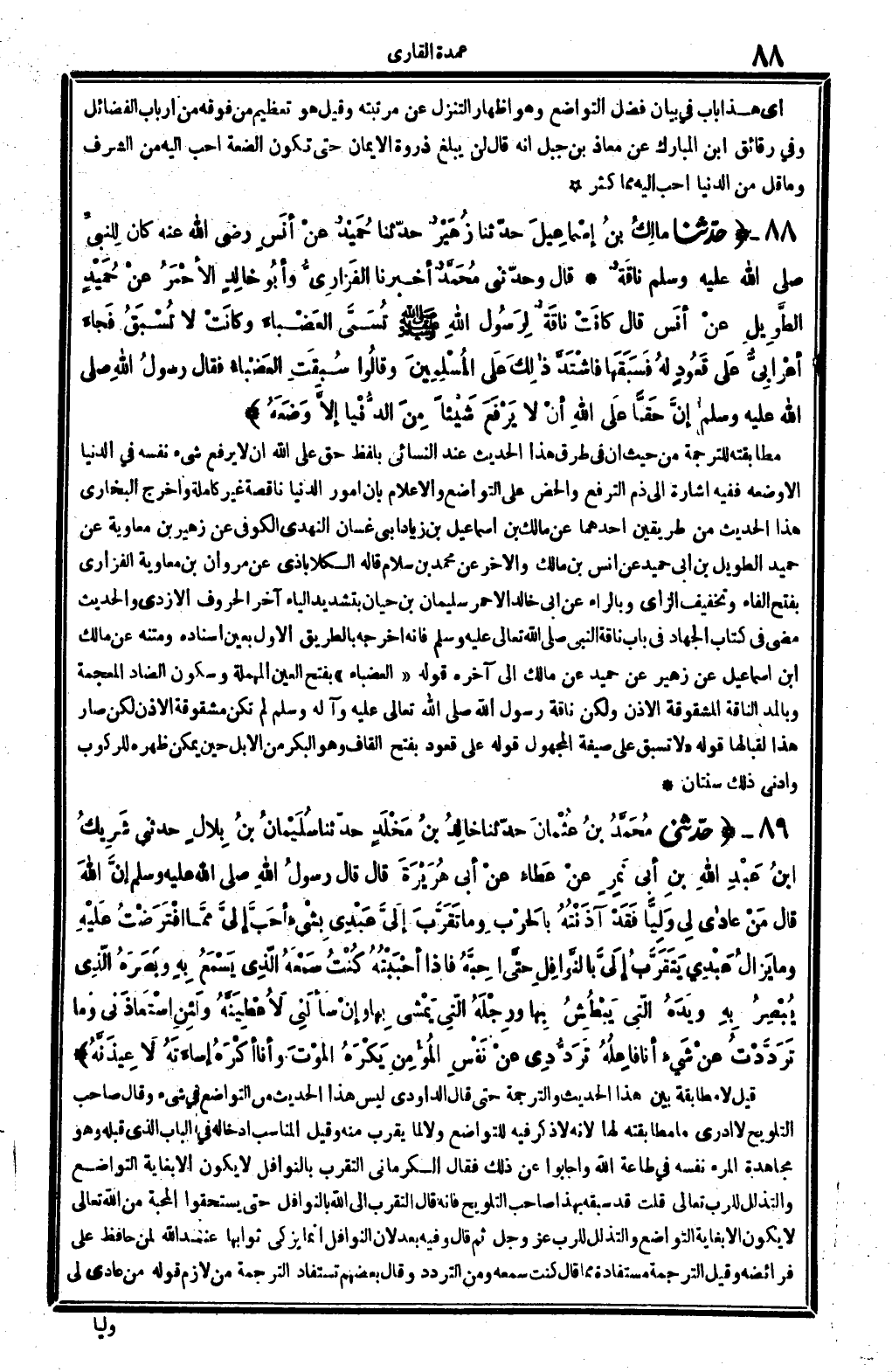 2056 - حدّثني مُحَمَّدُ بنُ عُثْمانَ حدّثنا خالِدُ بنُ مَخْلَدٍ حدّثنا سُلَيْمانُ بنُ بِلالٍ حَدثنِي شَرِيكُ بنُ عَبْدِ الله بن أبي نَمِرٍ عنْ عَطاءٍ عنْ أبي هُرَيْرَةَ قَالَ: قَالَ رسولُ الله صلى الله عَلَيْهِ وَسلم: (إنَّ الله قَالَ: مَنْ عاداى لِي وَليًّا فَقَدْ آذَنْتُهُ بالحَرْبِ، وَمَا تَقَرَّبَ إليَّ عَبْدِي بِشْيءٍ أحَبَّ إليَّ مِمَّا افْتَرَضْتُ عَلَيْهِ، وَمَا يَزالُ عَبْدِي يَتَقَرَّبُ إلَيَّ بالنَّوافِلِ حتَّى أحِبَّهُ، فَإِذا أحْبَبْتُهُ كُنْتُ سَمْعَهُ الّذِي يَسْمَعُ بِهِ، وبَصَرَهُ الّذِي يُبْصِرُ بِهِ، ويدَهُ الّتي يَبْطُشُ بِها، وَرِجْلَهُ الّتي يَمْشِي بهَا، وإنْ سألَنِي لأعْطِيَنَّهُ، ولَئِنِ اسْتَعاذَنِي وَمَا تَرَدَّدْتُ عنْ شَيْءٍ أَنا فاعِلُهُ تَرَدّدِي عنْ نَفْسِ المُؤْمِنِ يَكْرَهُ الموْتَ وَأَنا أكْرَهُ إساءَتَهُ لأعِيذَنَّهُ) .