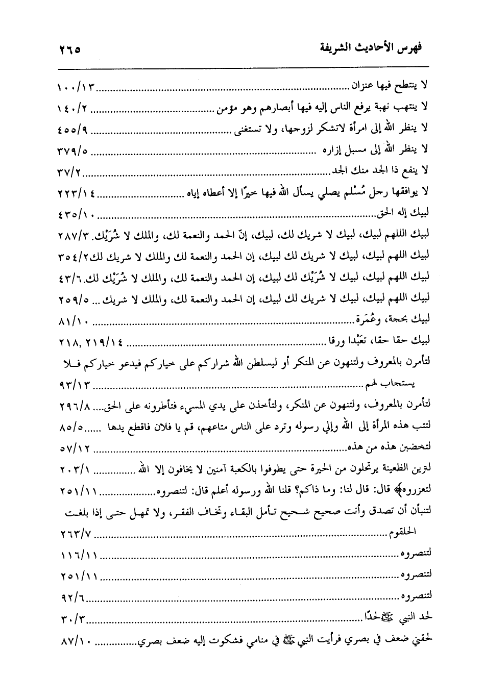 لَبَّيْكَ اللَّهُمَّ لَبَّيْكَ، لَبَّيْكَ لا شَرِيكَ لَكَ لَبَّيْكَ، إِنَّ الْحَمْدَ وَالنِّعْمَةَ لَكَ، وَالْمُلْكَ لا شريك 5/259