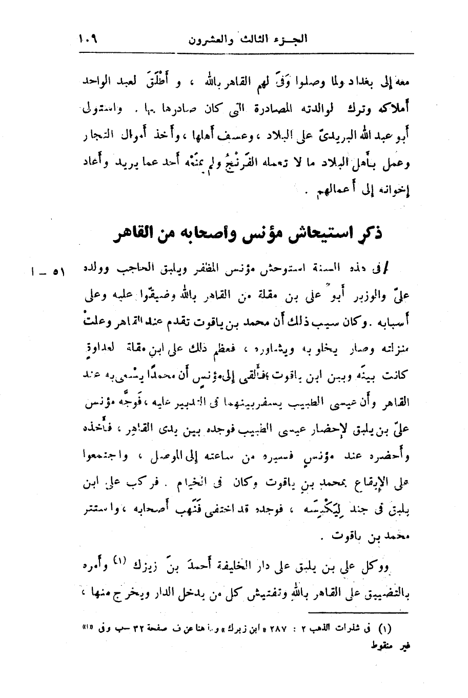 / فى هذه السنة استوحش مؤنس المظفر ويلبق الحاجب وولده علىّ والوزير أبو على بن مقلة من القاهر بالله وضيقّوا عليه وعلى أسبابه. وكان سبب ذلك أن محمد بن ياقوت تقدم عند القاهر وعلت منزلته وصار يخلوبه ويشاوره، فعظم ذلك على ابن مقلة لعداوة كانت بينه وبين ابن ياقوت؛ فألقى إلى مؤنس أن محمدا يسعى به عند القاهر وأن عيسى الطبيب يسفر بينهما فى التدبير عليه، فوجّه مؤنس علىّ بن يلبق لإحضار عيسى الطبيب فوجده بين يدى القاهر، فأخذه وأحضره عند مؤنس فسيره من ساعته إلى الموصل، واجتمعوا على الإيقاع بمحمد بن ياقوت وكان فى الخيام. فركب على ابن يلبق فى جند ليكسه، فوجده قد اختفى فنهب أصحابه، واستتر محمد بن ياقوت.