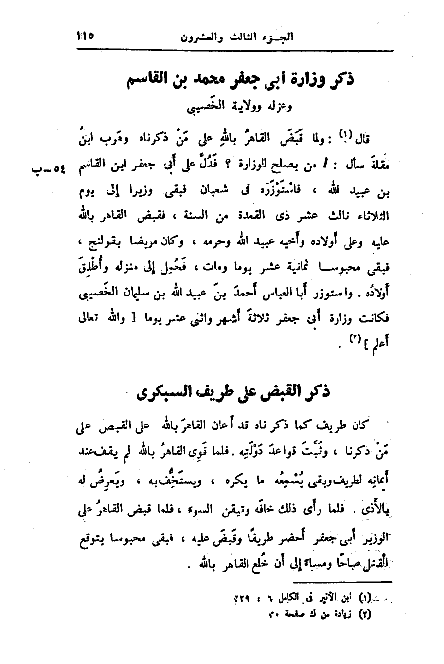قال «1» : ولما قبض القاهر بالله على من ذكرناه وهرب ابن مقلة سأل:/ من يصلح للوزارة؟ فدلّ على أبى جعفر ابن القاسم بن عبيد الله، فاستوزره فى شعبان فبقى وزيرا إلى يوم الثلاثاء ثالث عشر ذى القعدة من السنة، فقبض القاهر بالله عليه وعلى أولاده وأخيه عبيد الله وحرمه، وكان مريضا بقولنج، فبقى محبوسا ثمانية عشر يوما ومات، فحمل إلى منزله وأطلق أولاده. واستوزر أبا العباس أحمد بن عبيد الله بن سليمان الخصيبى فكانت وزارة أبى جعفر ثلاثة أشهر واثنى عشر يوما [والله تعالى أعلم] «2» .