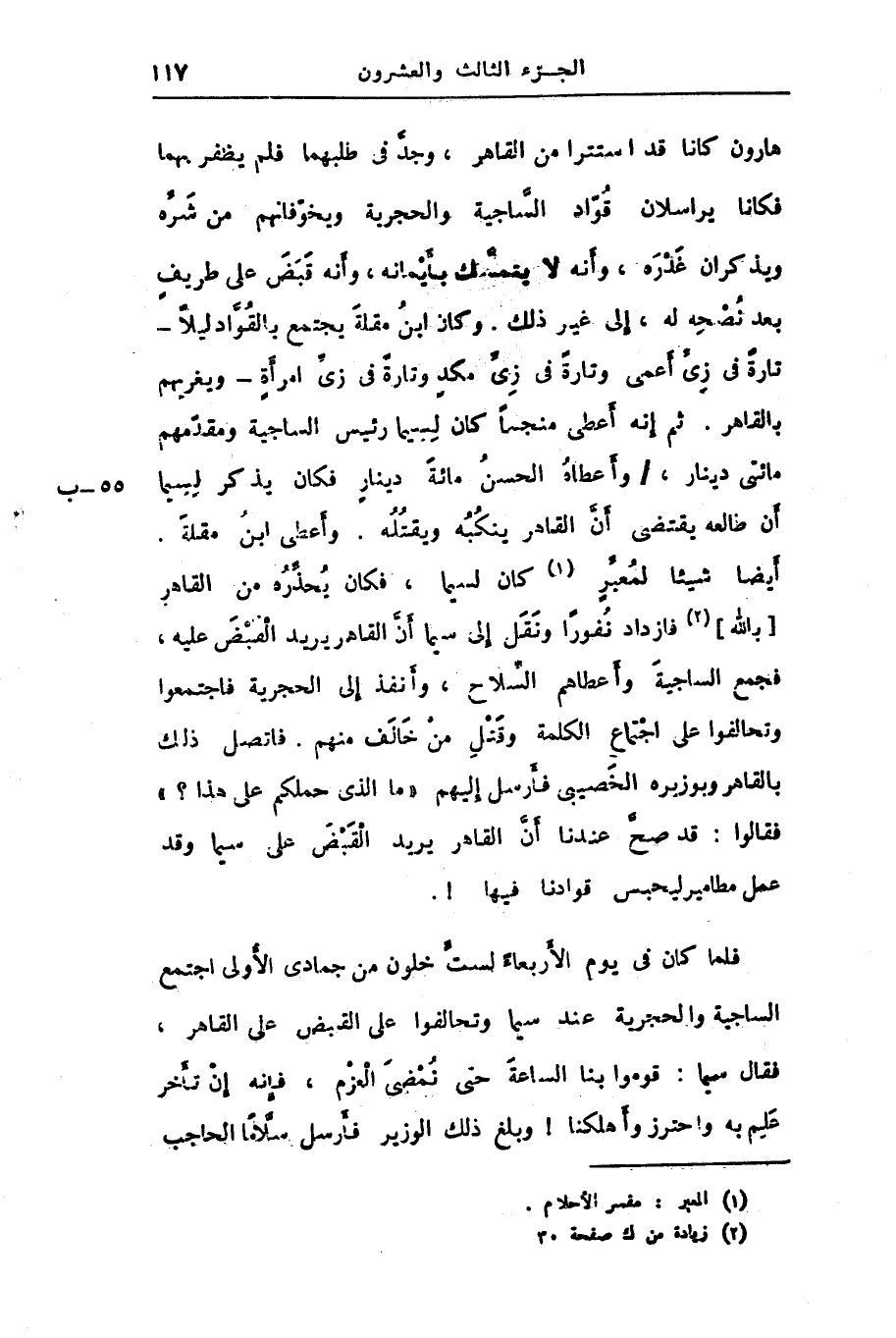 هارون كانا قد استترا من القاهر، وجدّ فى طلبهما فلم يظفر بهما فكانا يراسلان قوّاد السّاجية والحجرية ويخوّفانهم من شرّه ويذكران غدره، وأنه لا يتمسّك بأيمانه، وأنه قبض على طريف بعد نصحه له، إلى غير ذلك. وكان ابن مقلة يجتمع بالقوّاد ليلا- تارة فى زىّ أعمى وتارة فى زىّ مكد وتارة فى زىّ امرأة- ويغربهم بالقاهر. ثم إنه أعطى منجما كان لسيما رئيس الساجية ومقدّمهم مائتى دينار،/ وأعطاه الحسن مائة دينار فكان يذكر لسيما أن طالعه يقتضى أنّ القاهر ينكبه ويقتله. وأعطى ابن مقلة.