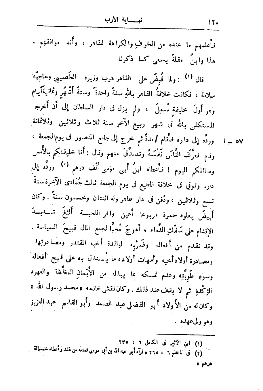 فأعلمهم ما عنده من الخوف والكراهة للقاهر، وأنه موافقهم، هذا وابن مقلة يسعى كما ذكرنا قال «1» : ولما قبض على القاهر هرب وزيره الخصيبى وحاجبه سلامة، فكانت خلافة القاهر بالله سنة واحدة وستة أشهر وثمانية أيام وهو أول خليفة سمل، ولم يزل فى دار السلطان إلى أن أخرج المستكفى بالله فى شهر ربيع الآخر سنة ثلاث وثلاثين وثلاثمائة وردّه إلى داره فأقام/ مدة ثم خرج إلى جامع المنصور فى يوم الجمعة، وقام فعرّف النّاس نفسه وتصدّق منهم وقال: أنا خليفتكم بالأمس وسائلكم اليوم! فأعطاه ابن أبى موسى ألف درهم»