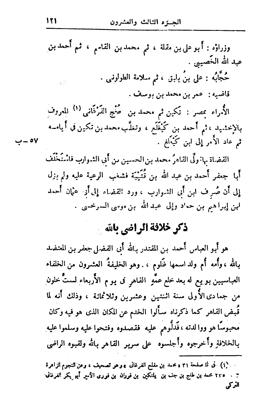 الأمراء بمصر: تكين ثم محمد بن صغج الفرغانى «1» المعروف بالإخشيد، ثم أحمد بن كيغلع، وتغلّب محمد بن تكين فى أيامه ثم عاد الأمر إلى ابن كيعلغ.