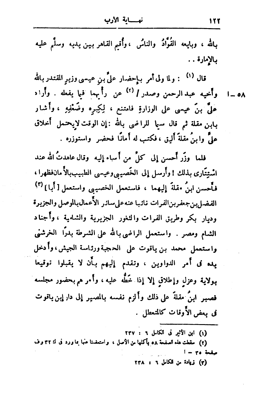 فلما وزر أحسن إلى كلّ من أساء إليه وقال عاهدت الله عند استتارى بذلك! وأرسل إلى الخصيبى وعيسى الطبيب بالأمان فظهرا، فأحسن ابن مقلة إليهما، فاستعمل الخصيبى واستعمل [أبا] «3» الفضل بن جعفر بن الفرات نائبا عنه على سائر الأعمال بالموصل والجزيرة وديار بكر وطريق الفرات والثغور الجزيرية والشامية، وأجناد الشام ومصر. واستعمل الراضى بالله على الشرطة بدرا الخرشنى واستعمل محمد بن ياقوت على الحجبة ورئاسة الجيش، وأدخل يده فى أمر الدواوين، وتقدم إليهم بأن لا يقبلوا توقيعا بولاية وعزل وإطلاق إلا إذا خطّه عليه، وأمرهم بحضور مجلسه فصبر ابن مقلة على ذلك وألزم نفسه بالمصير إلى دار إبن ياقوت فى بعض الأوقات كالمتعطل.