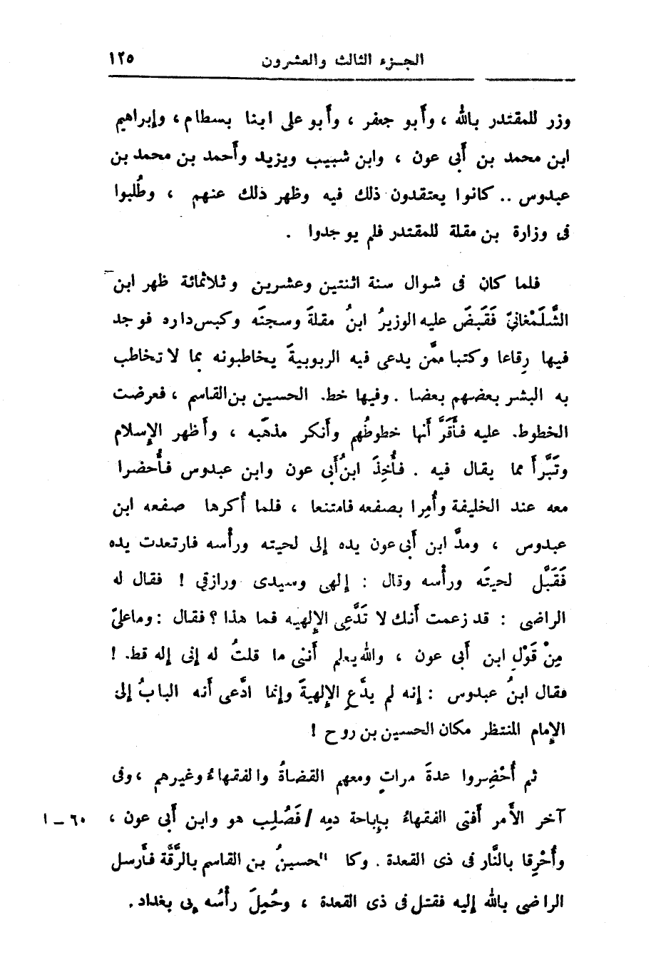 فلما كان فى شوال سنة اثنتين وعشرين وثلاثمائة ظهر ابن الشّلمغانىّ فقبض عليه الوزير ابن مقلة وسجنه وكبس داره فوجد فيها رقاعا وكتبا ممّن يدعى فيه الربوبية يخاطبونه بما لا تخاطب به البشر بعضهم بعضا. وفيها خط الحسين بن القاسم، فعرضت الخطوط عليه فأقرّ أنها خطوطهم وأنكر مذهبه، وأظهر الإسلام وتبّرأ مما يقال فيه. فأخذ ابن أبى عون وابن عبدوس فأحضرا معه عند الخليفة وأمرا بصفعه فامتنعا، فلما أكرها صفعه ابن عبدوس، ومدّ ابن أبى عون يده إلى لحيته ورأسه فارتعدت يده فقبّل لحيته ورأسه وقال: إلهى وسيدى ورازقى! فقال له الراضى: قد زعمت أنك لا تدّعى الإلهيه فما هذا؟ فقال: وما علىّ من قول ابن أبى عون، والله يعلم أننى ما قلت له إنى إله قط! فقال ابن عبدوس: إنه لم يدّع الإلهية وإنما ادّعى أنه الباب إلى الإمام المنتظر مكان الحسين بن روح! ثم أحضروا عدة مرات ومعهم القضاة والفقهاء وغيرهم، وفى آخر الأمر أفتى الفقهاء بإباحة دمه/ فصلب هو وابن أبى عون، وأحرقا بالنّار فى ذى القعدة. وكان الحسين بن القاسم بالرّقّة فأرسل الراضى بالله إليه فقتل فى ذى القعدة، وحمل رأسه إلى بغداد.