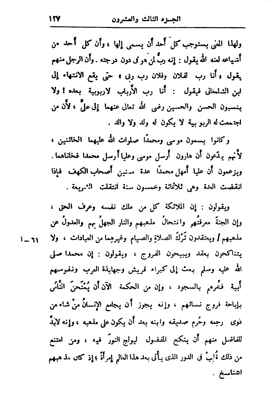 ولهذا المعنى يستوجب كل أحد أن يسمى إلها، وأن كل أحد من أشياعه لعنه الله يقول: إنه ربّ لمن هو فى دون درجته. وأن الرجل منهم يقول «أنا رب لفلان وفلان رب ربى» حتى يقع الانتهاء إلى ابن الشلمعانى فيقول: أنا رب الأرباب لا ربوبية بعده! ولا ينسبون الحسن والحسين رضى الله تعالى عنهما إلى علىّ، لأن من اجتمعت له الربوبية لا يكون له ولد ولا والد.