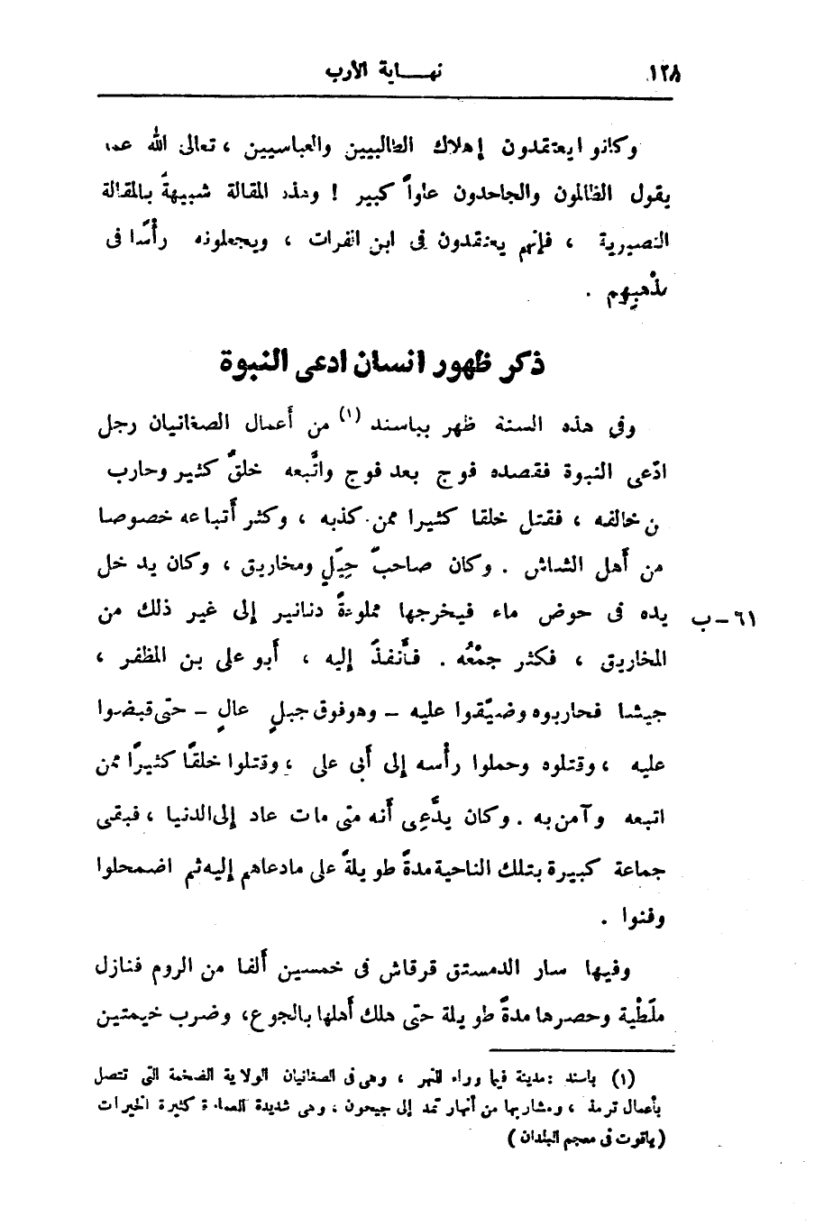 وفى هذه السنة ظهر بباسند «1» من أعمال الصغانيان رجل ادّعى النبوة فقصده فوج بعد فوج واتّبعه خلق كثير وحارب من خالفه، فقتل خلقا كثيرا ممن كذبه، وكثر أتباعه خصوصا من أهل الشاش. وكان صاحب حيل ومخاريق، وكان يدخل يده فى حوض ماء فيخرجها مملوءة دنانير إلى غير ذلك من المخاريق، فكثر جمعه. فأنفذ إليه، أبو على بن المظفر، جيشا فحاربوه وضيّقوا عليه- وهو فوق جبل عال- حتى قبضوا عليه، وقتلوه وحملوا رأسه إلى أبى على، وقتلوا خلقا كثيرا ممن اتبعه وآمن به. وكان يدّعى أنه متى مات عاد إلى الدنيا، فبقى جماعة كبيرة بتلك الناحية مدة طويلة على ما دعاهم إليه ثم اضمحلوا وفنوا.