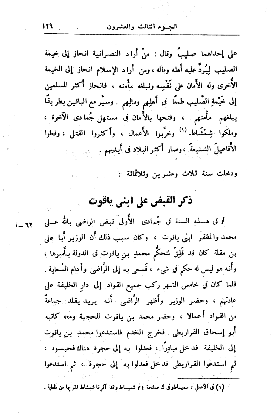 / فى هذه السنة فى جمادى الأولى قبض الراضى بالله على محمد والمظفر ابنى ياقوت، وكان سبب ذلك أن الوزير أبا على بن مقلة كان قد قلق لتحكّم محمد بن ياقوت فى الدولة بأسرها، وأنه هو ليس له حكم فى شىء، فسعى به إلى الرّاضى وأدام السّعاية.
