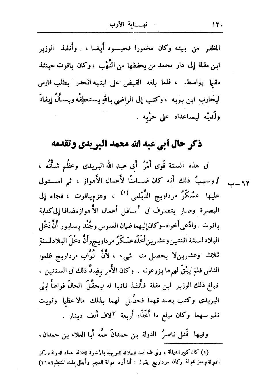 فى هذه السنة قوى أمر أبى عبد الله البريدى وعظم شأنه،/ وسبب ذلك أنه كان ضامنا لأعمال الأهواز، ثم استولى عليها عسكر مرداويج الدّيلمى «1» ، وهزم ياقوت، فجاء إلى البصرة وصار يتصرف فى أسافل أعمال الأهواز مضافا إلى كتابة ياقوت. وادّعى أخواه- وكان إليهما ضمان السوس وجند يسابور أنّ دخل البلاد لسنة اثنتين وعشرين أخذه عسكر مرداويج وأنّ دخل البلاد لسنة ثلاث وعشرين لا يحصل منه شىء، لأنّ نوّاب مرداويج ظلموا الناس فلم يبق لهم ما يزرعونه. وكان الأمر بضدّ ذلك فى السنتين، فبلغ ذلك الوزير ابن مقلة فأنفذ نائبا له ليحقّق الحال فواطأ ابنى البريدى وكتب بصدقهما فحصّل لهما بذلك مالا عظيما وقويت نفوسهما وكان مبلغ ما أخذاه أربعة آلاف ألف دينار.